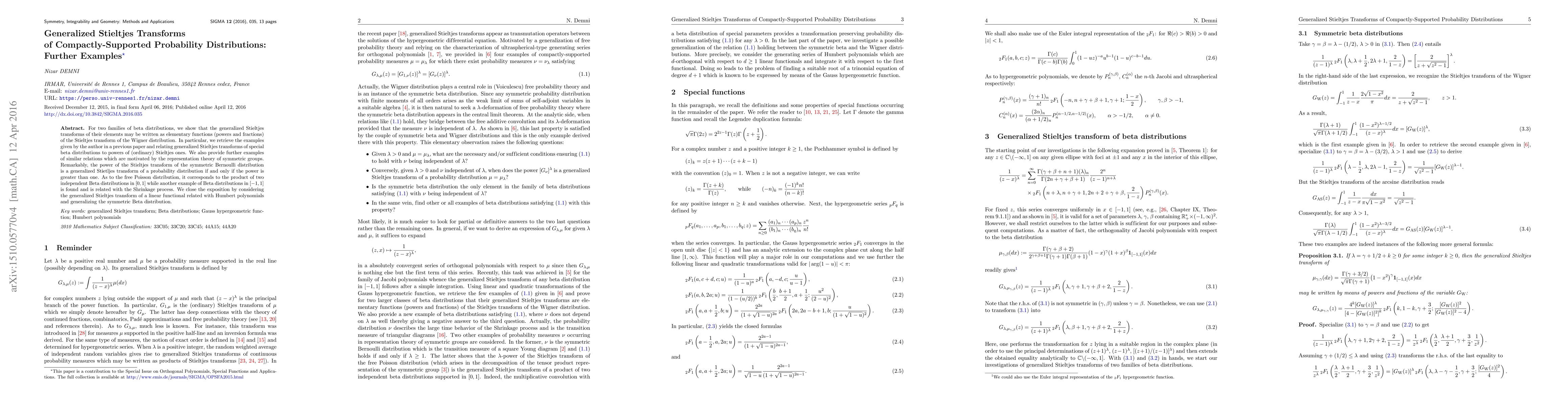 This paper explores the generalized Stieltjes transforms of two families of beta distributions, showing they can be expressed as elementary functions of the Stieltjes transform of the Wigner distribution. It also provides new examples motivated by symmetric group representation theory, including the special case of the symmetric Bernoulli distribution and the free Poisson distribution.
