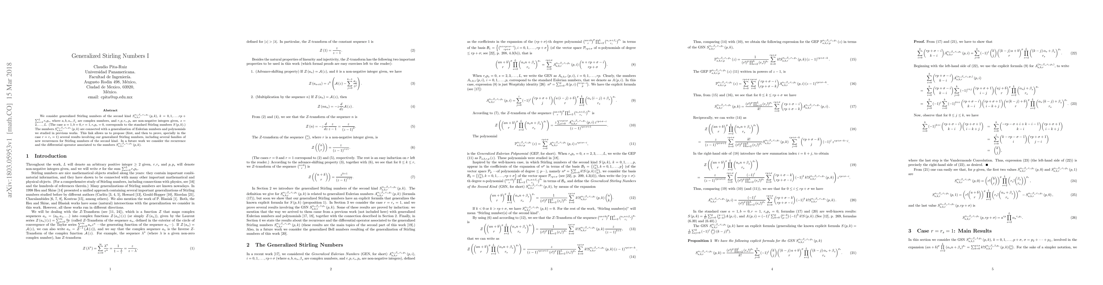 We consider generalized Stirling numbers of the second kind $% S_{a,b,r}^{\alpha_{s},\beta_{s},r_{s},p_{s}}\left( p,k\right) $, $% k=0,1,\ldots .rp+\sum_{s=2}^{L}r_{s}p_{s}$, where $a,b,\alpha_{s},\beta_{s} $ are complex numbers, and $r,p,r_{s},p_{s}$ are non-negative integers given, $s=2,\ldots ,L$. (The case $a=1,b=0,r=1,r_{s}p_{s}=0$, corresponds to the standard Stirling numbers $S\left( p,k\right) $.) The numbers $% S_{a,b,r}^{\alpha_{s},\beta_{s},r_{s},p_{s}}\left( p,k\right) $ are connected with a generalization of Eulerian numbers and polynomials we studied in previous works. This link allows us to propose (first, and then to prove, specially in the case $r=r_{s}=1$) several results involving our generalized Stirling numbers, including several families of new recurrences for Stirling numbers of the second kind. In a future work we consider the recurrence and the differential operator associated to the numbers $% S_{a,b,r}^{\alpha_{s},\beta_{s},r_{s},p_{s}}\left( p,k\right) $.
