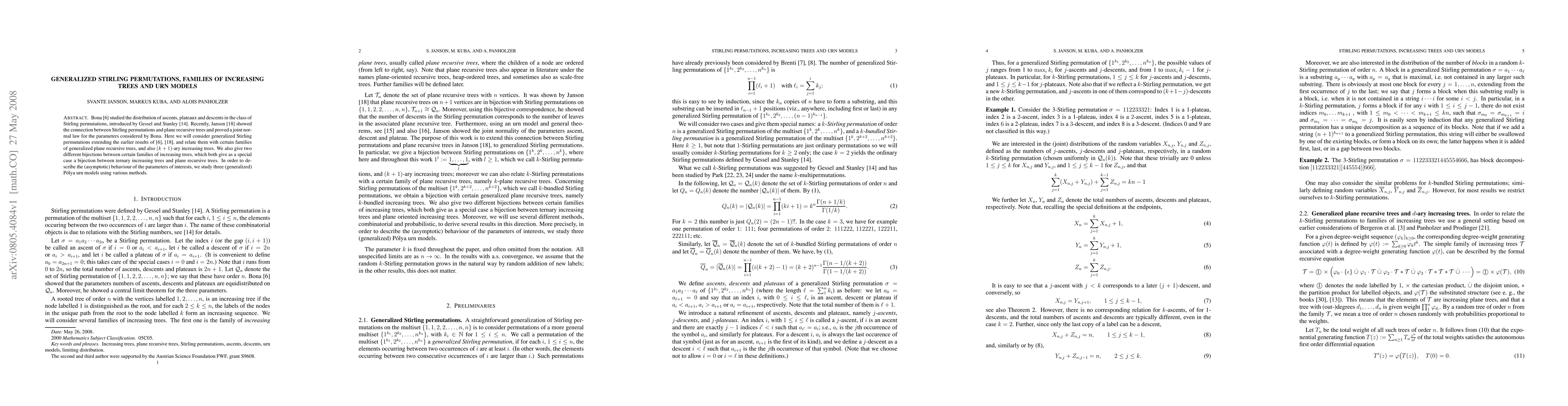 Bona [2007+] studied the distribution of ascents, plateaux and descents in the class of Stirling permutations, introduced by Gessel and Stanley [1978]. Recently, Janson [2008+] showed the connection between Stirling permutations and plane recursive trees and proved a joint normal law for the parameters considered by Bona. Here we will consider generalized Stirling permutations extending the earlier results of Bona and Janson, and relate them with certain families of generalized plane recursive trees, and also $(k+1)$-ary increasing trees. We also give two different bijections between certain families of increasing trees, which both give as a special case a bijection between ternary increasing trees and plane recursive trees. In order to describe the (asymptotic) behaviour of the parameters of interests, we study three (generalized) Polya urn models using various methods.