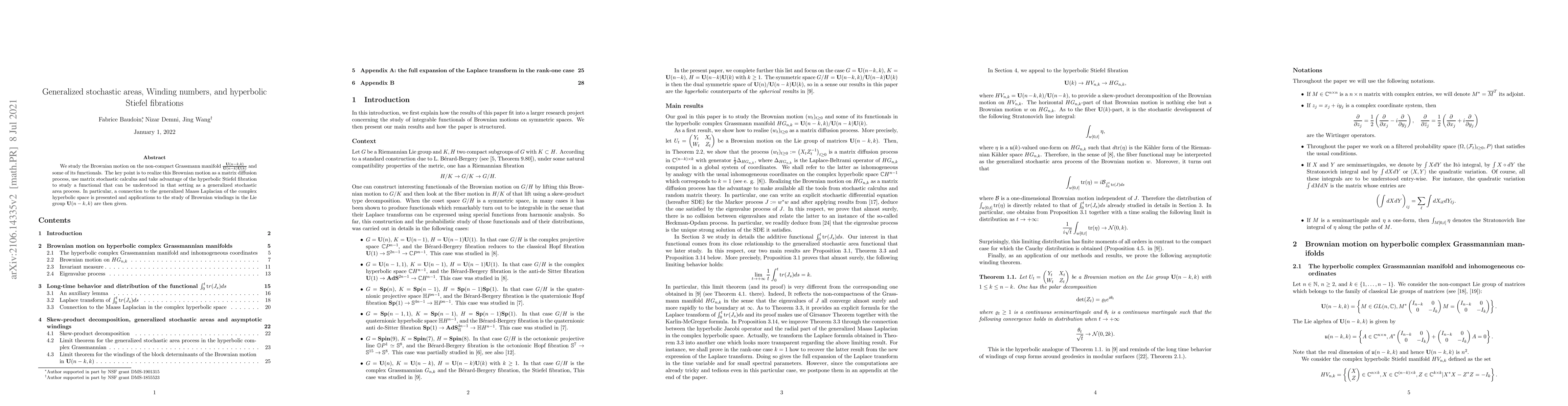 This paper explores Brownian motion on a specific Grassmann manifold, representing it as a matrix diffusion process. It connects this to a generalized stochastic area process via the hyperbolic Stiefel fibration, linking it to the generalized Maass Laplacian in complex hyperbolic space. The research also examines Brownian windings in the U(n-k,k) Lie group.