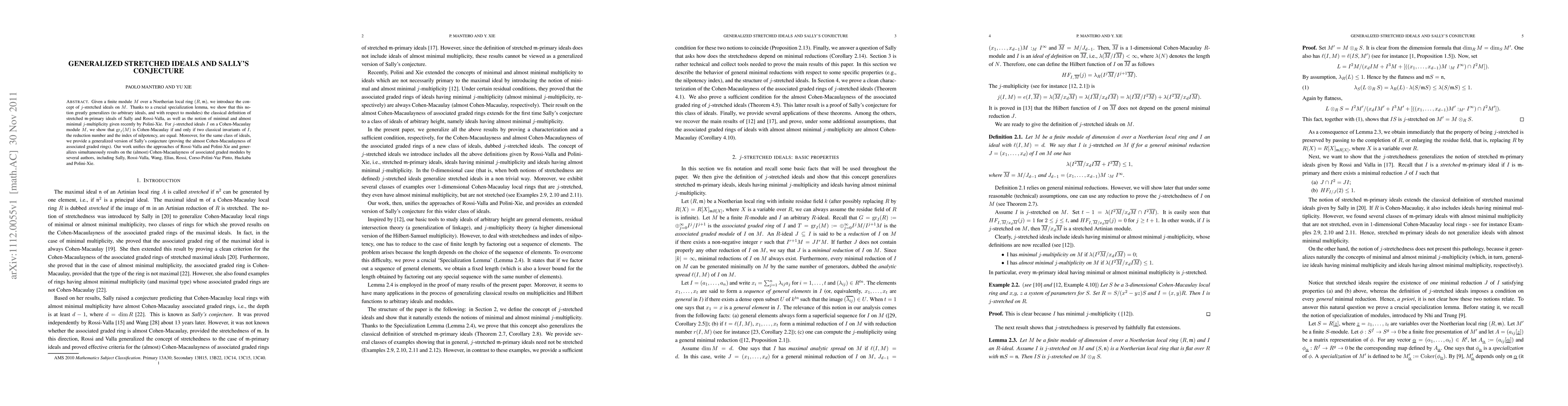 Given a finite module $M$ over a Noetherian local ring $(R, \m)$, we introduce the concept of $j$-stretched ideals on $M$. Thanks to a crucial specialization lemma, we show that this notion greatly generalizes (to arbitrary ideals, and with respect to modules) the classical definition of stretched $\m$-primary ideals of Sally and Rossi-Valla, as well as the notion of minimal and almost minimal $j$-multiplicity given recently by Polini-Xie. For $j$-stretched ideals $I$ on a Cohen-Macaulay module $M$, we show that ${\rm gr}_I(M)$ is Cohen-Macaulay if and only if two classical invariants of $I$, the reduction number and the index of nilpotency, are equal. Moreover, for the same class of ideals, we provide a generalized version of Sally's conjecture (proving the almost Cohen-Macaulayness of associated graded rings). Our work unifies the approaches of Rossi-Valla and Polini-Xie and generalizes simultaneously results on the (almost) Cohen-Macaulayness %and almost Cohen-Macaulayness of associated graded modules by several authors, including Sally, Rossi-Valla, Wang, Elias, Rossi, Corso-Polini-Vaz Pinto, Huckaba and Polini-Xie.