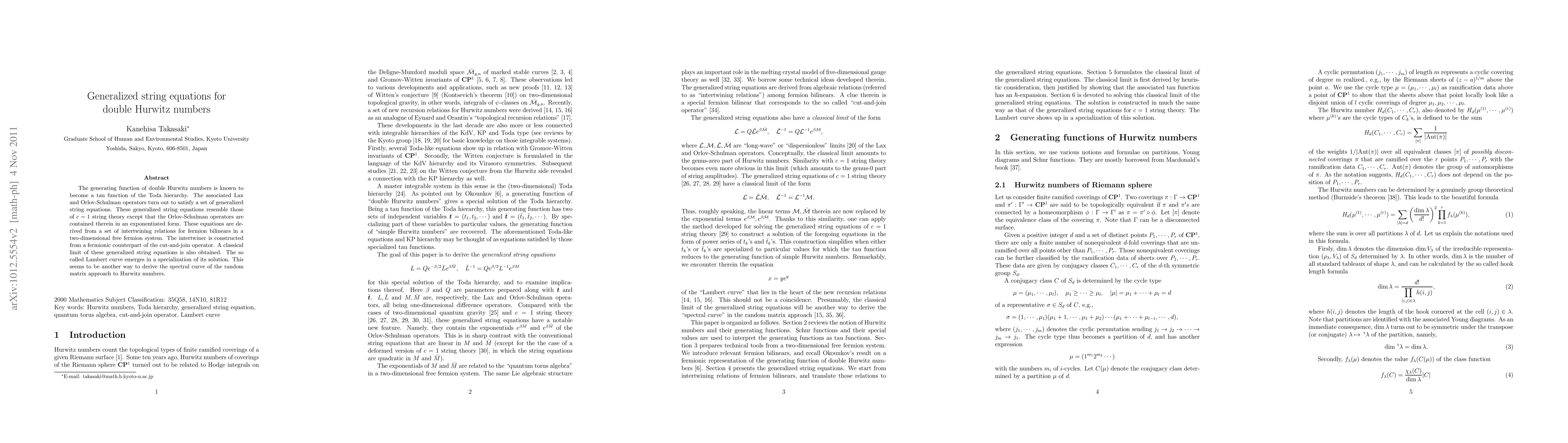 A new set of equations, similar to string theory, are derived from a two-dimensional free fermion system, providing a potential alternative method for calculating double Hurwitz numbers.