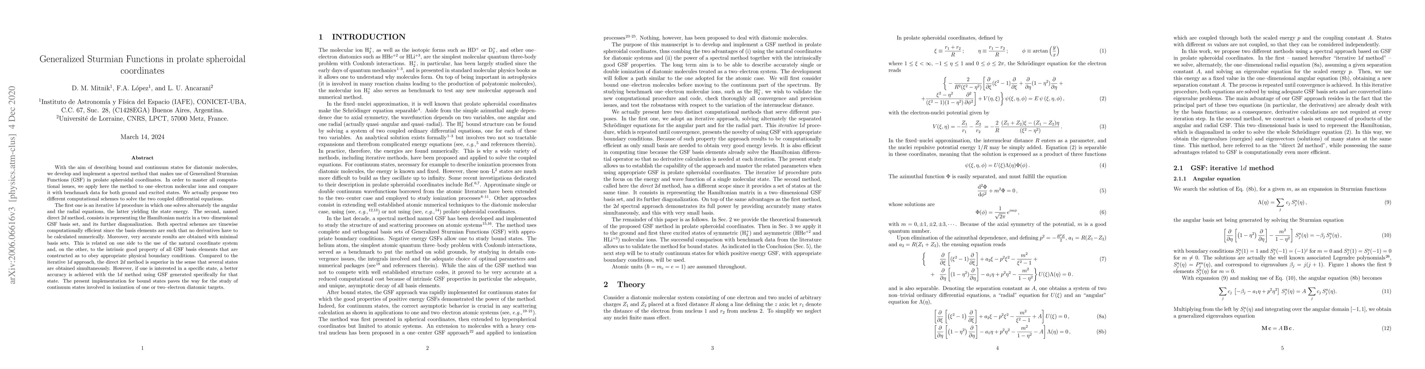 This paper develops a spectral method using Generalized Sturmian Functions in prolate spheroidal coordinates to describe bound and continuum states for diatomic molecules. It proposes two computational schemes: an iterative 1d method and a direct 2d method, both achieving high accuracy and computational efficiency with minimal basis sets.