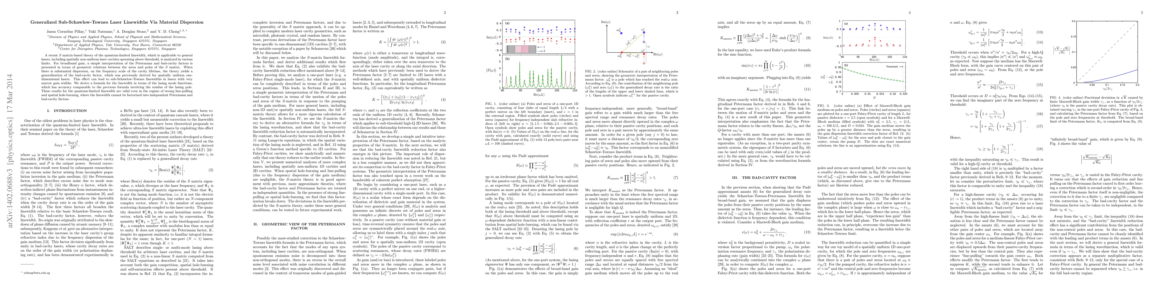 A recent S matrix-based theory of the quantum-limited linewidth, which is applicable to general lasers, including spatially non-uniform laser cavities operating above threshold, is analyzed in various limits. For broadband gain, a simple interpretation of the Petermann and bad-cavity factors is presented in terms of geometric relations between the zeros and poles of the S matrix. When there is substantial dispersion, on the frequency scale of the cavity lifetime, the theory yields a generalization of the bad-cavity factor, which was previously derived for spatially uniform one-dimensional lasers. This effect can lead to sub-Schawlow-Townes linewidths in lasers with very narrow gain widths. We derive a formula for the linewidth in terms of the lasing mode functions, which has accuracy comparable to the previous formula involving the residue of the lasing pole. These results for the quantum-limited linewidth are valid even in the regime of strong line-pulling and spatial hole-burning, where the linewidth cannot be factorized into independent Petermann and bad-cavity factors.