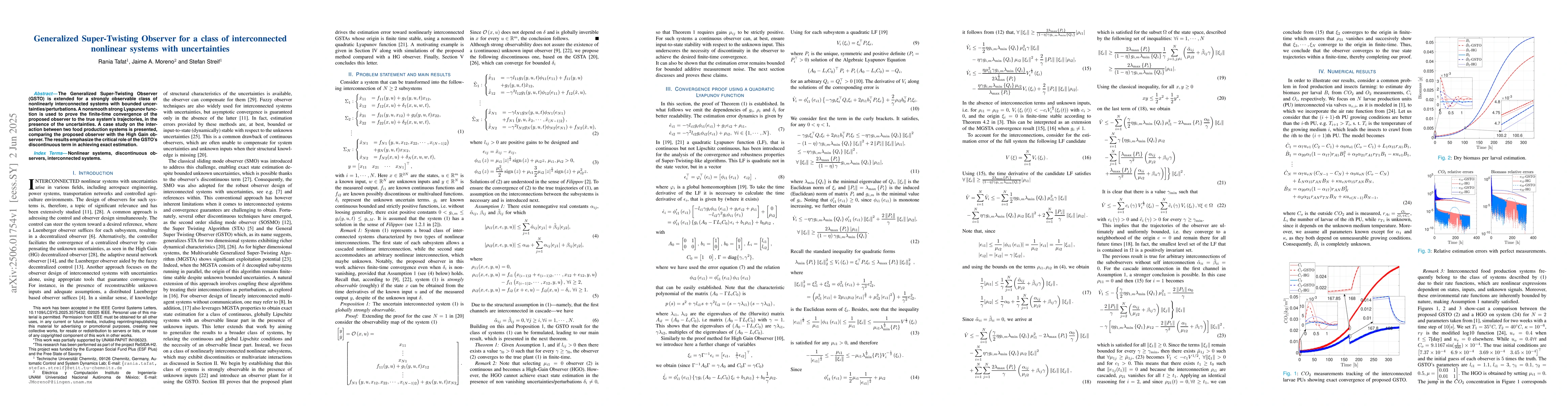 The research extends the Generalized Super-Twisting Observer (GSTO) for interconnected nonlinear systems with uncertainties, employing a nonsmooth strong Lyapunov function to prove finite-time convergence.