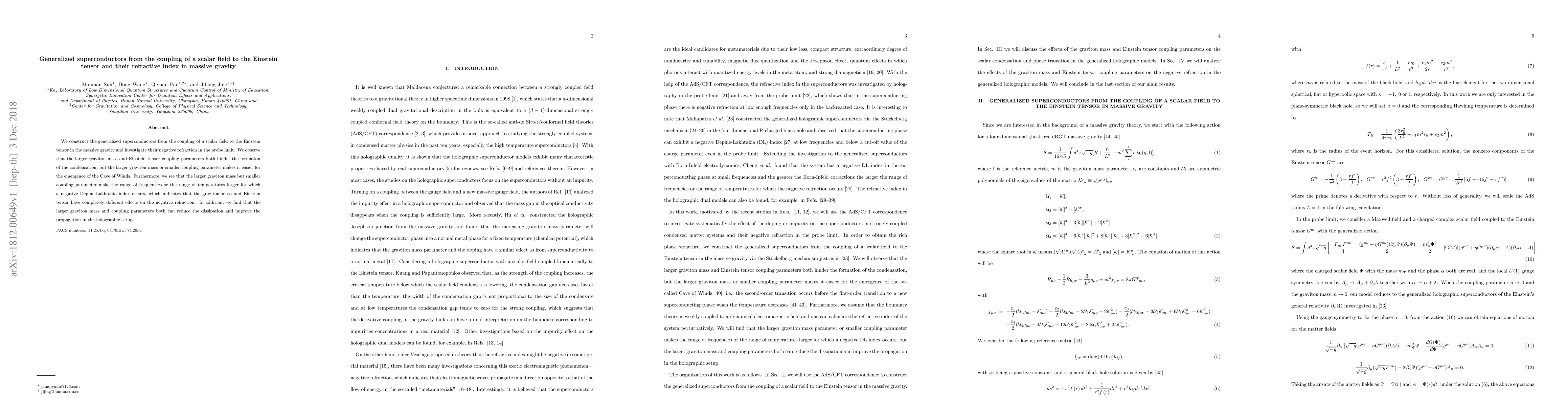 This paper constructs generalized superconductors by coupling a scalar field to the Einstein tensor in massive gravity and examines their refractive index. It finds that while larger graviton mass and coupling parameters hinder condensation, they also enhance the range of frequencies or temperatures for negative refraction, indicating distinct effects on refraction. Additionally, these parameters improve propagation and reduce dissipation in the holographic setup.