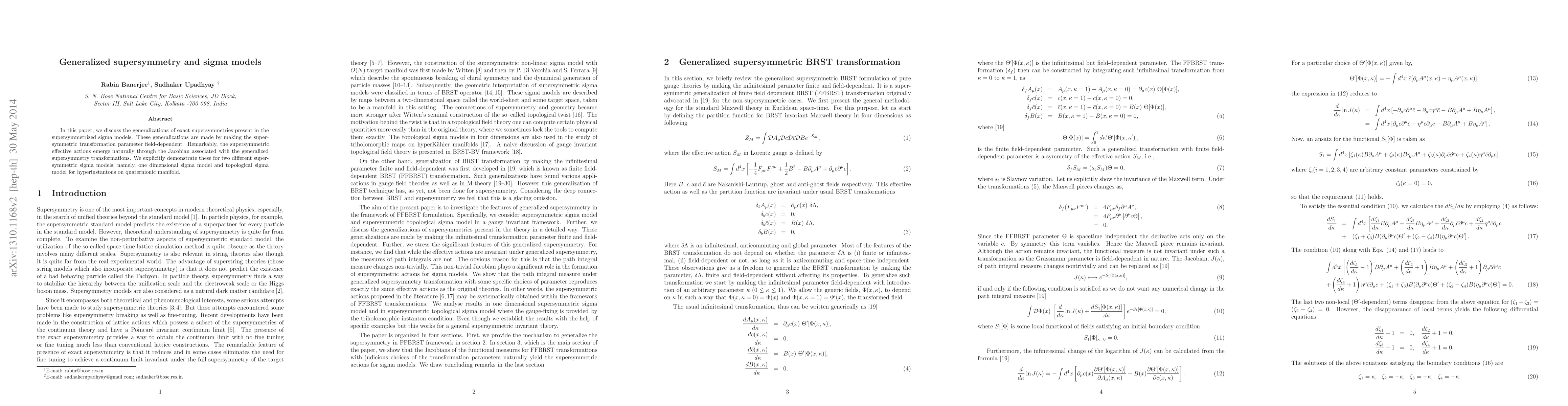 This paper explores the generalization of exact supersymmetries in supersymmetrized sigma models by introducing field-dependent transformation parameters. The study reveals that the supersymmetric effective actions naturally arise through the Jacobian of these generalized transformations, demonstrated explicitly for both one-dimensional and topological sigma models.