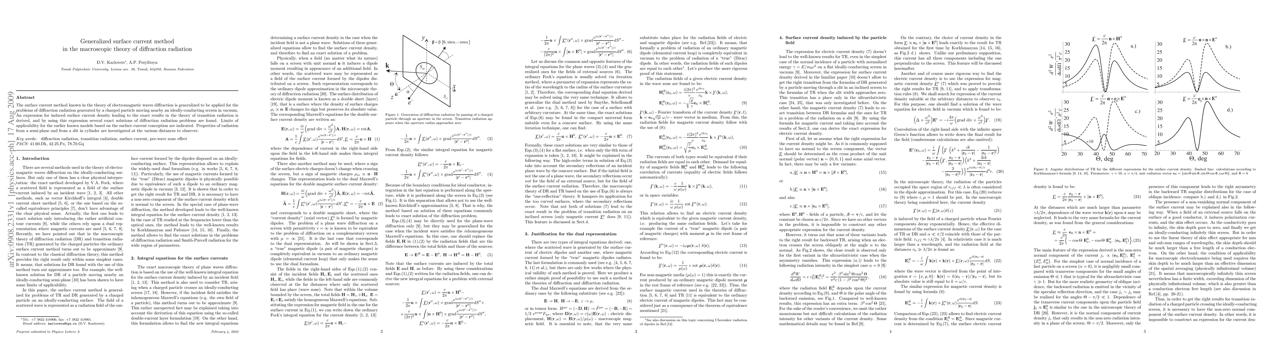 The surface current method known in the theory of electromagnetic waves diffraction is generalized to be applied for the problems of diffraction radiation generated by a charged particle moving nearby an ideally-conducting screen in vacuum. An expression for induced surface current density leading to the exact results in the theory of transition radiation is derived, and by using this expression several exact solutions of diffraction radiation problems are found. Limits of applicability for the earlier known models based on the surface current conception are indicated. Properties of radiation from a semi-plane and from a slit in cylinder are investigated at the various distances to observer.