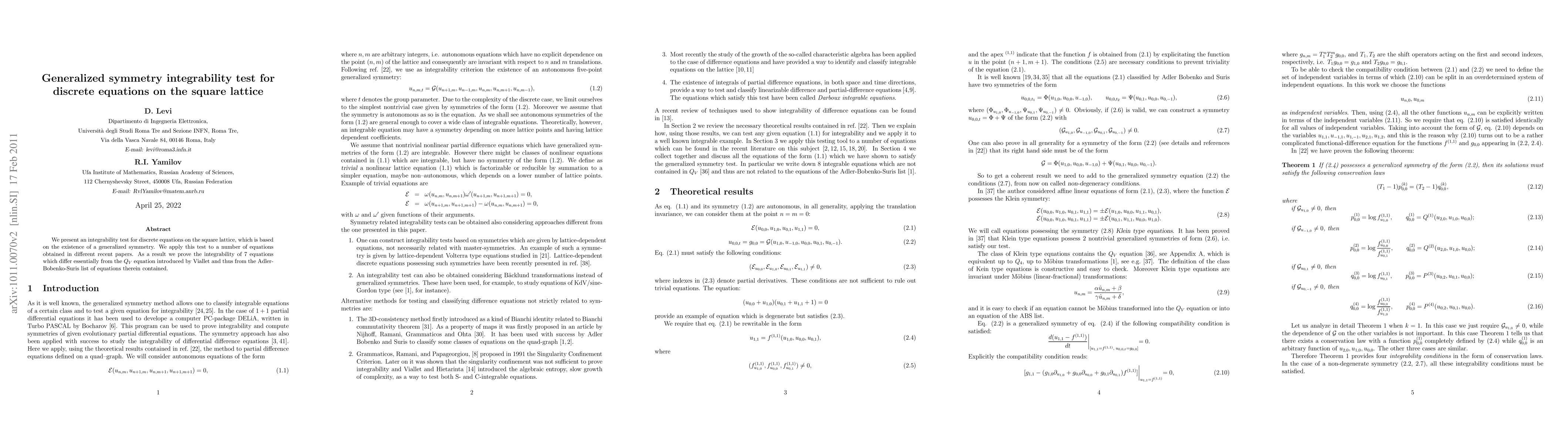 The paper introduces an integrability test for discrete equations on square lattices based on generalized symmetries, applying it to demonstrate the integrability of seven distinct equations not previously included in the Adler-Bobenko-Suris list. This method extends the known integrability criteria for these systems.