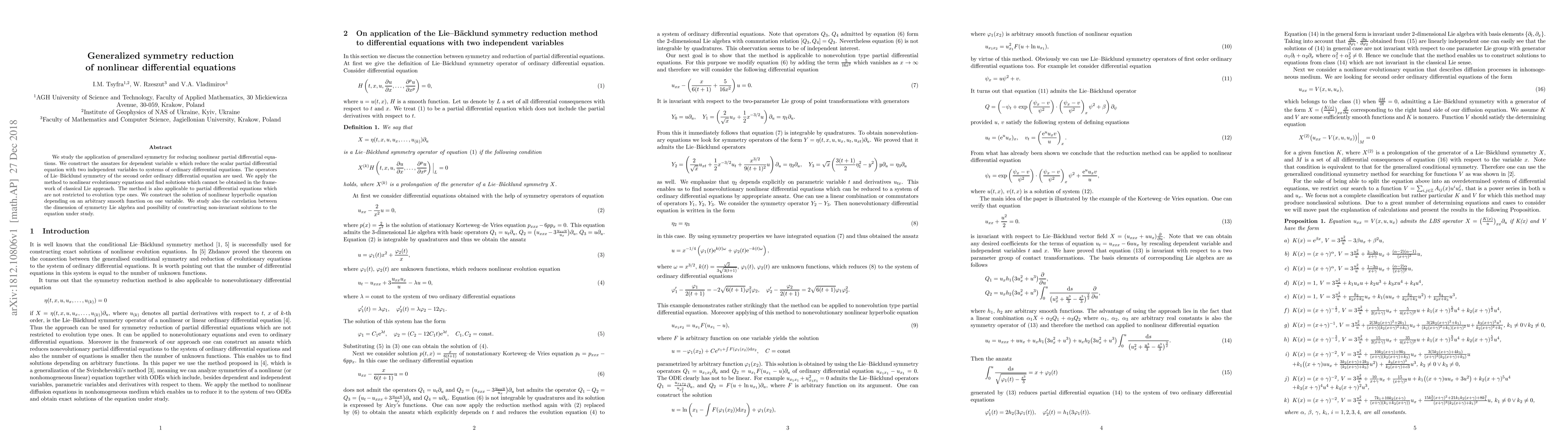 This paper explores the use of generalized symmetry reduction to simplify nonlinear partial differential equations into ordinary differential equations, employing Lie-Bäcklund symmetry operators. It successfully applies this method to nonlinear evolutionary and hyperbolic equations, uncovering solutions beyond the reach of classical Lie symmetry approaches.