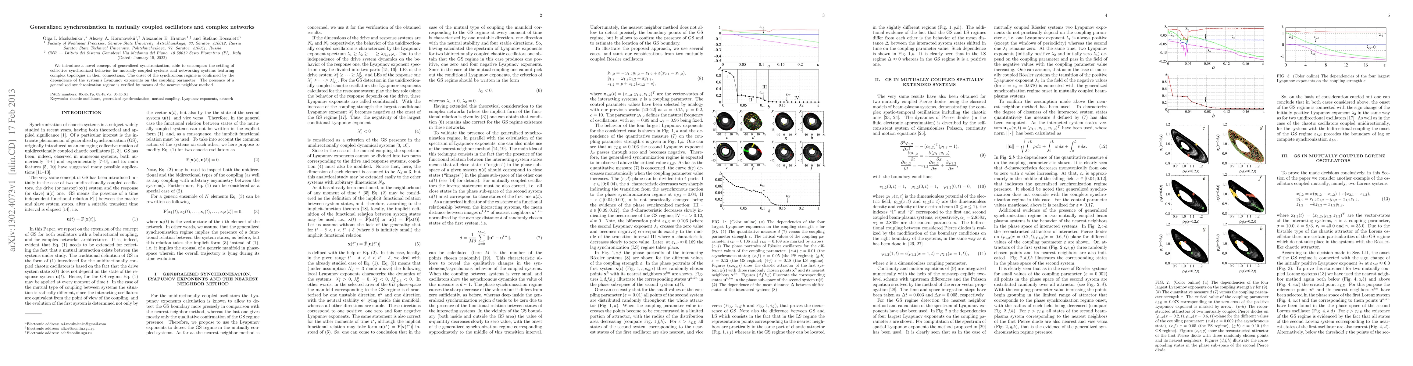 This paper introduces a concept of generalized synchronization that describes collective synchronized behavior in mutually coupled oscillators and complex networks, verified through Lyapunov exponents and nearest neighbor methods. The study confirms the onset of a synchronous regime based on the coupling parameter.