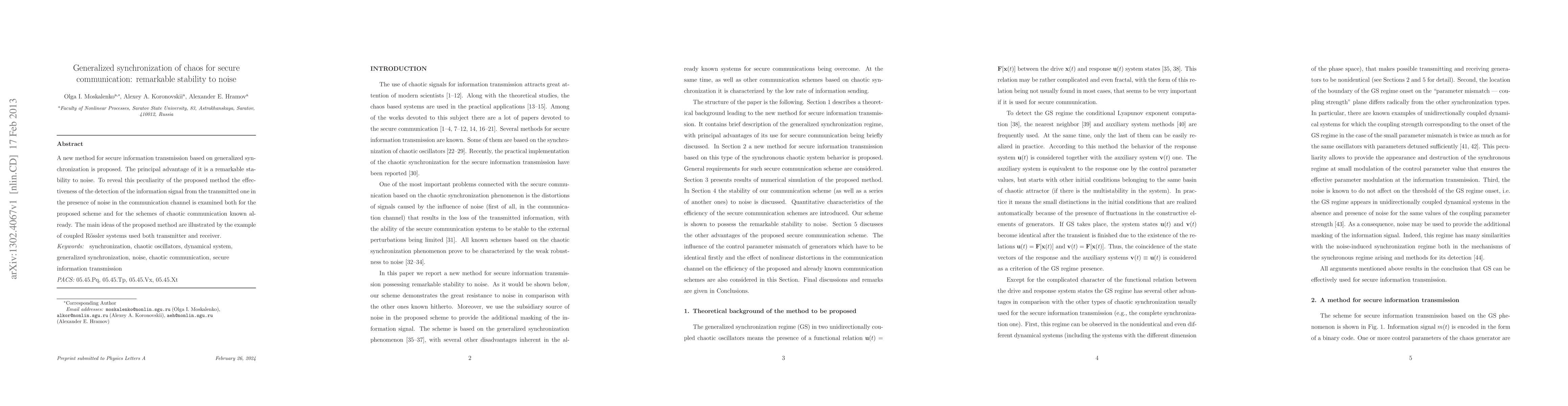 This paper proposes a new method for secure information transmission using generalized synchronization, demonstrating remarkable stability to noise. The method's effectiveness in detecting information signals amidst noise is compared to existing chaotic communication schemes, illustrated using coupled Rössler systems.