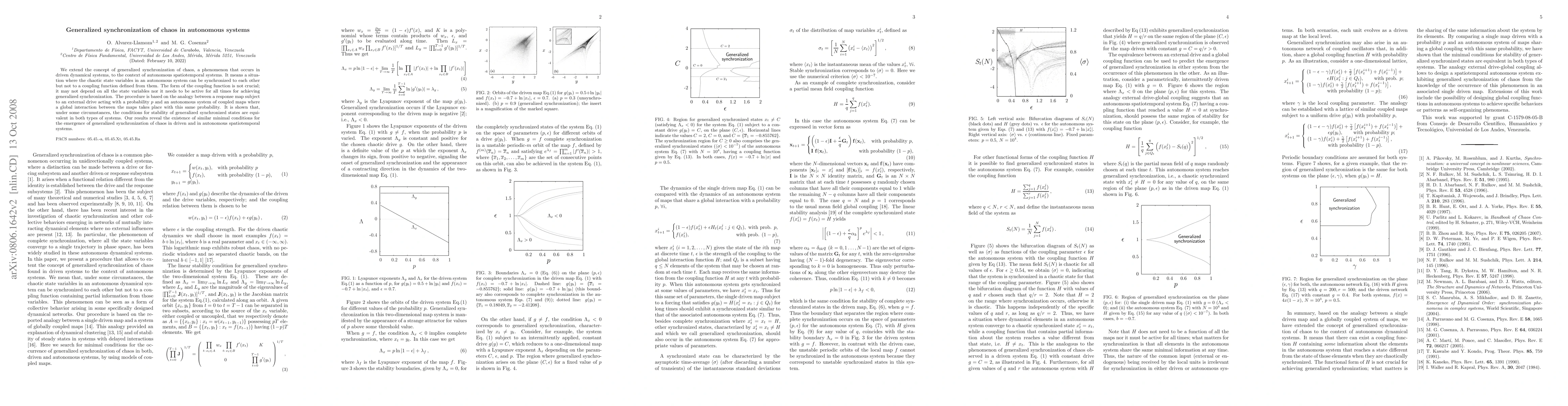 We extend the concept of generalized synchronization of chaos, a phenomenon that occurs in driven dynamical systems, to the context of autonomous spatiotemporal systems. It means a situation where the chaotic state variables in an autonomous system can be synchronized to each other but not to a coupling function defined from them. The form of the coupling function is not crucial; it may not depend on all the state variables nor it needs to be active for all times for achieving generalized synchronization. The procedure is based on the analogy between a response map subject to an external drive acting with a probability p and an autonomous system of coupled maps where a global interaction between the maps takes place with this same probability. It is shown that, under some circumstances, the conditions for stability of generalized synchronized states are equivalent in both types of systems. Our results reveal the existence of similar minimal conditions for the emergence of generalized synchronization of chaos in driven and in autonomous spatiotemporal systems.