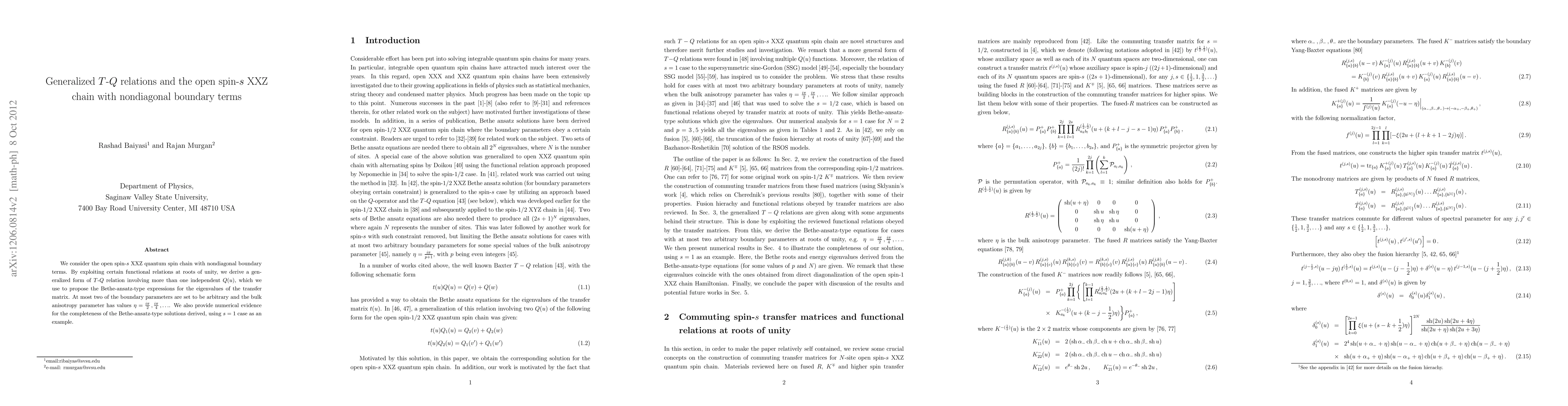 This paper derives generalized T-Q relations for the open spin-s XXZ quantum spin chain with nondiagonal boundary terms, proposing Bethe-ansatz-type expressions for transfer matrix eigenvalues. Numerical evidence supports the completeness of the derived solutions, exemplified with the s = 1 case.
