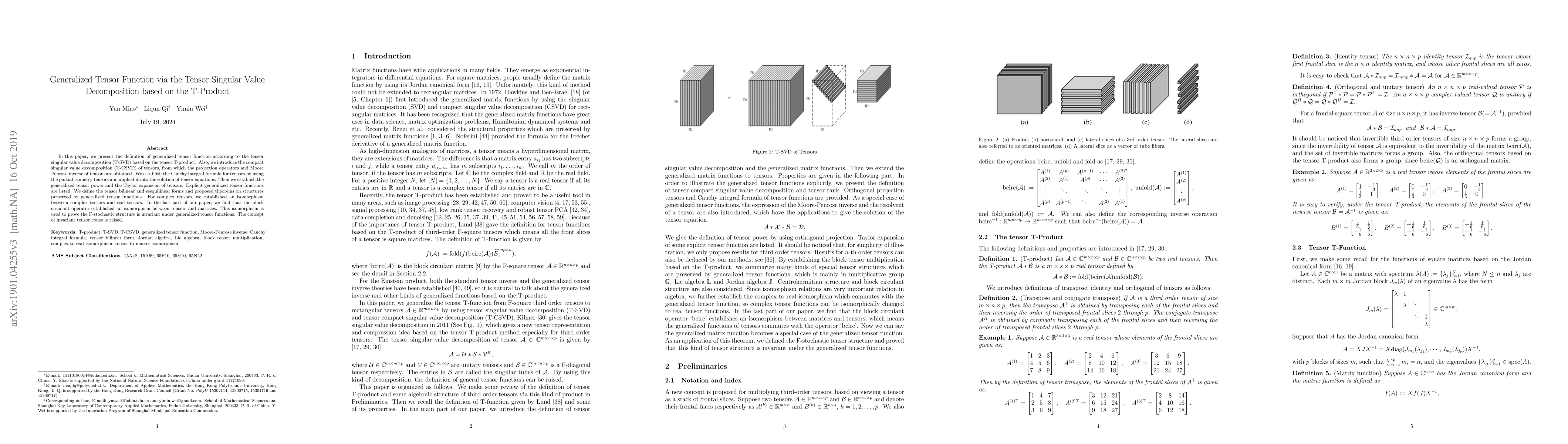 This paper introduces generalized tensor functions through tensor singular value decomposition and tensor T-product, establishing a compact singular value decomposition, Cauchy integral formula, and generalized tensor power. It also explores tensor bilinear and sesquilinear forms, complex tensor isomorphisms, and invariant structures under generalized tensor functions.