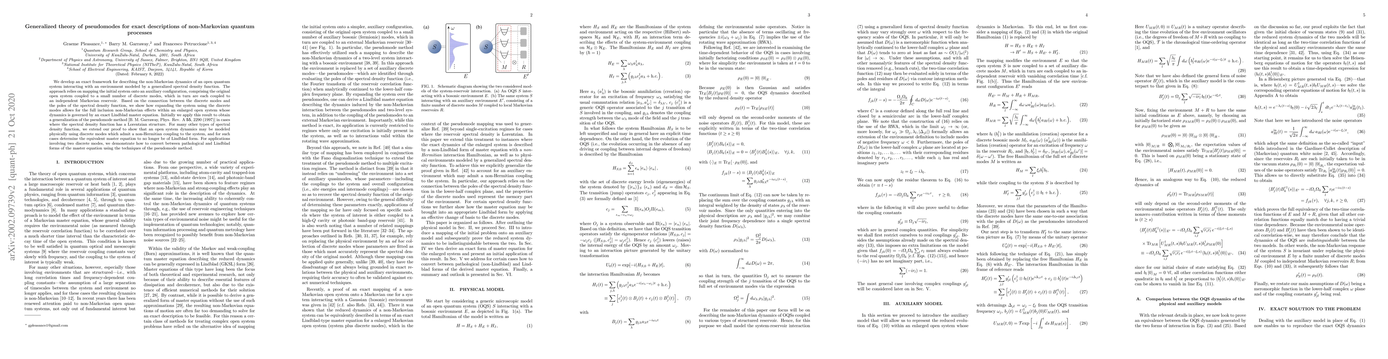 The paper introduces a generalized theory of pseudomodes, enabling exact descriptions of non-Markovian quantum processes by mapping the system onto discrete modes coupled to Markovian reservoirs, and derives a master equation that can be either Lindblad or pathological depending on the spectral density structure.