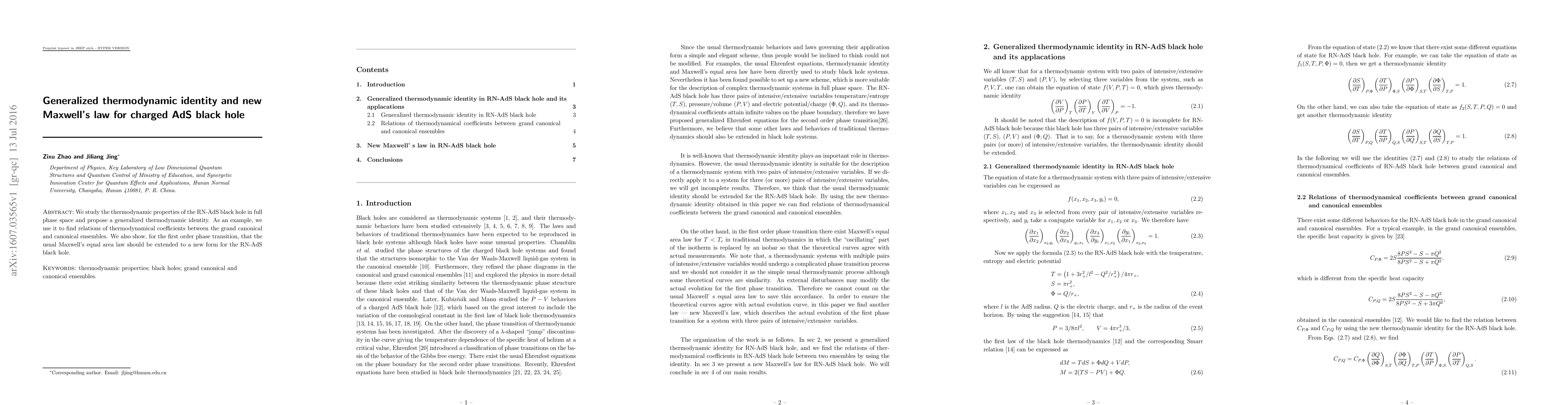 We study the thermodynamic properties of the RN-AdS black hole in full phase space and propose a generalized thermodynamic identity. As an example, we use it to find relations of thermodynamical coefficients between the grand canonical and canonical ensembles. We also show, for the first order phase transition, that the usual Maxwell's equal area law should be extended to a new form for the RN-AdS black hole.