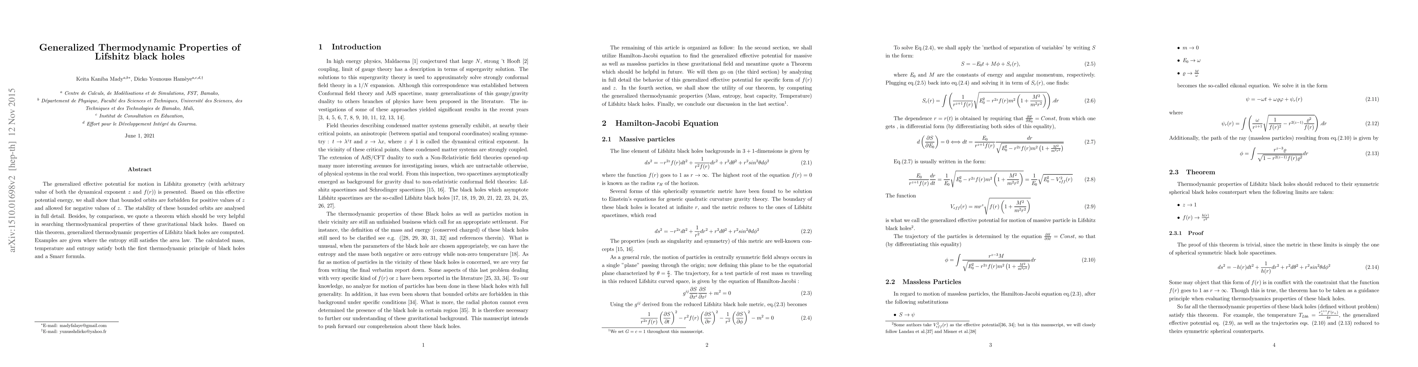 The generalized effective potential for motion in Lifshitz geometry (with arbitrary value of both the dynamical exponent $z$ and $f(r)$) is presented. Based on this effective potential energy, we shall show that bounded orbits are forbidden for positive values of $z$ and allowed for negative values of $z$. The stability of these bounded orbits are analysed in full detail. Besides, by comparison, we quote a theorem which should be very helpful in searching thermodynamical properties of these gravitational black holes. Based on this theorem, generalized thermodynamic properties of Lifshitz black holes are computed. Examples are given where the entropy still satisfies the area law. The calculated mass, temperature and entropy satisfy both the first thermodynamic principle of black holes and a Smarr formula.
