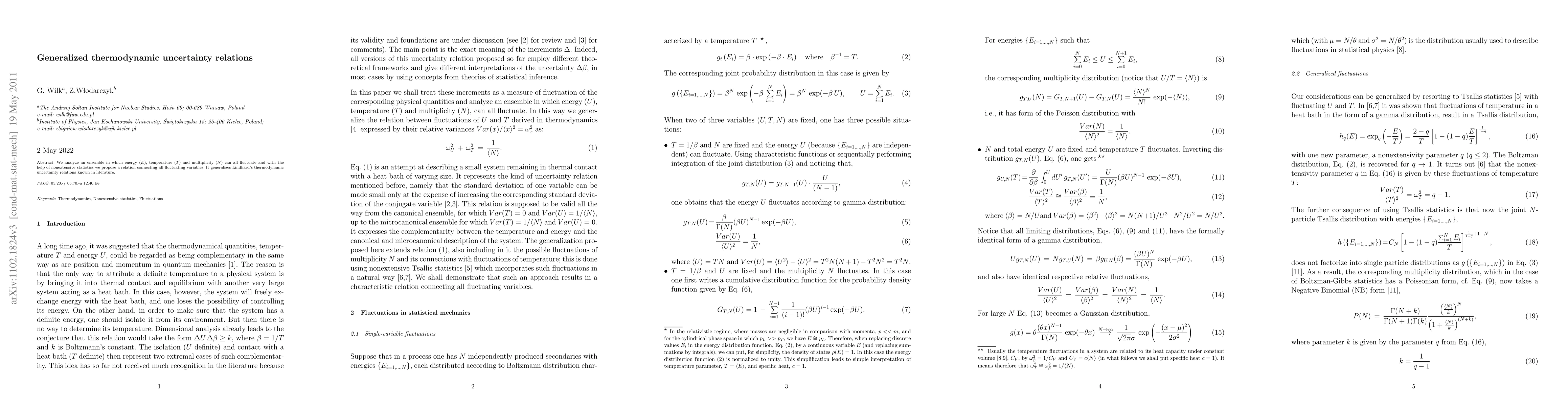 The paper proposes a generalized thermodynamic uncertainty relation using nonextensive statistics, connecting fluctuating energy, temperature, and multiplicity in an ensemble, extending beyond traditional Lindhard's thermodynamic uncertainty principles.