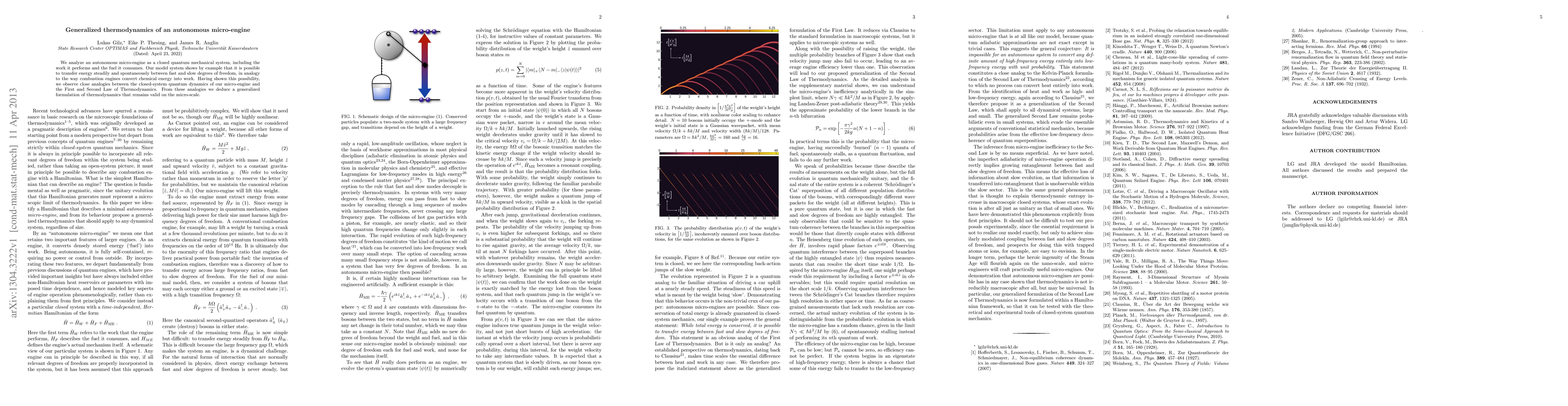 We analyze an autonomous micro-engine as a closed quantum mechanical system, including the work it performs and the fuel it consumes. Our model system shows by example that it is possible to transfer energy steadily and spontaneously between fast and slow degrees of freedom, in analogy to the way combustion engines convert chemical energy into work. Having shown this possibility, we observe close analogies between the closed-system quantum dynamics of our micro-engine and the First and Second Law of Thermodynamics. From these analogies we deduce a generalized formulation of thermodynamics that remains valid on the micro-scale.