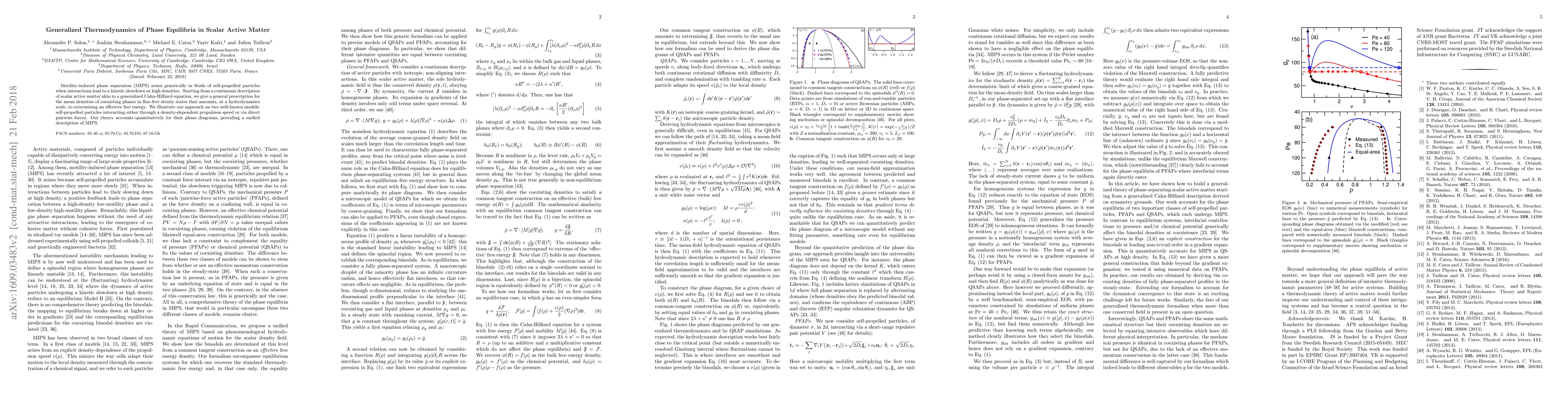 The paper presents a generalized thermodynamic theory for phase-separating scalar active matter, explicitly constructing binodals at leading non-trivial order in a gradient expansion and providing a more general construction beyond this expansion.