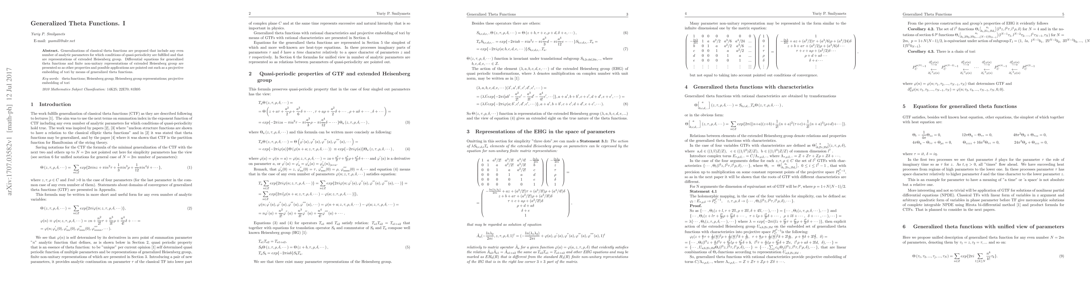 This paper proposes generalized theta functions with an even number of analytic parameters, fulfilling quasi-periodicity conditions and representing the extended Heisenberg group. It also presents differential equations for these functions and discusses their applications, including a projective embedding of tori.