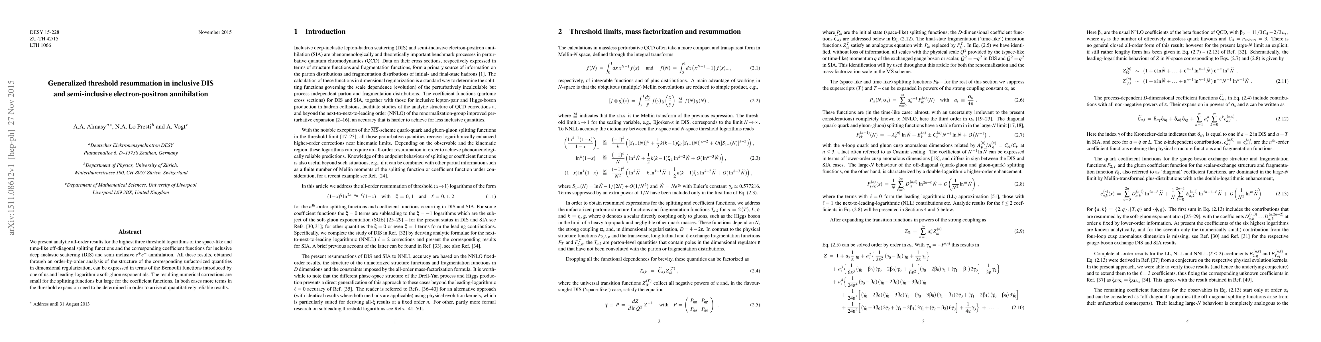 This paper provides analytic all-order results for the highest three threshold logarithms in inclusive deep-inelastic scattering and semi-inclusive electron-positron annihilation, expressed in terms of Bernoulli functions and leading-logarithmic soft-gluon exponentials. While corrections for splitting functions are small, those for coefficient functions are large, necessitating further terms in the threshold expansion for reliable results.