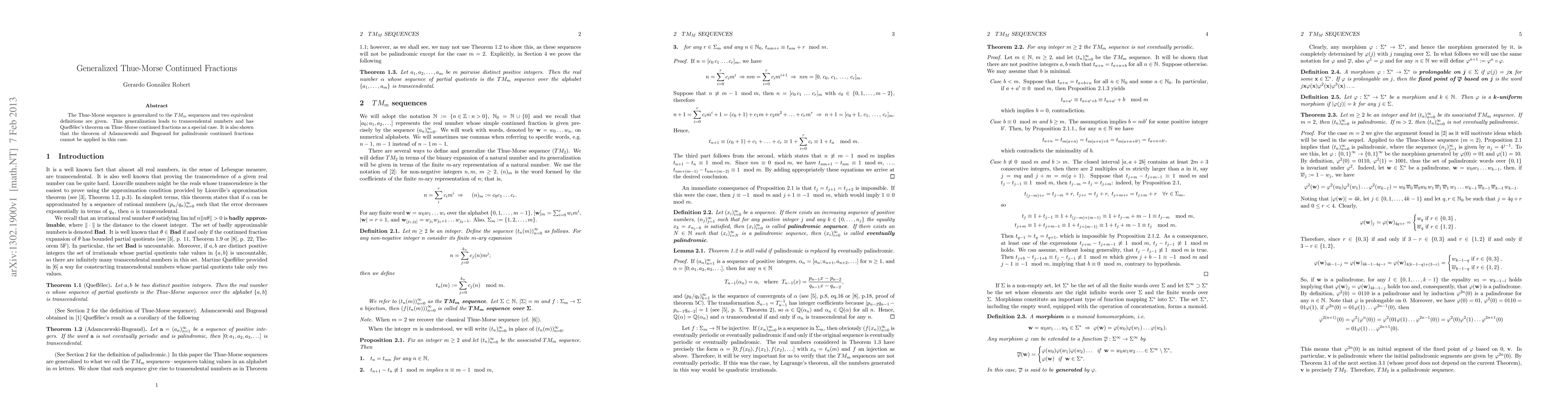 The paper introduces and analyzes generalized Thue-Morse sequences ($TM_m$), proving their transcendental nature and distinguishing them from palindromic sequences, thereby extending previous work on Thue-Morse continued fractions.