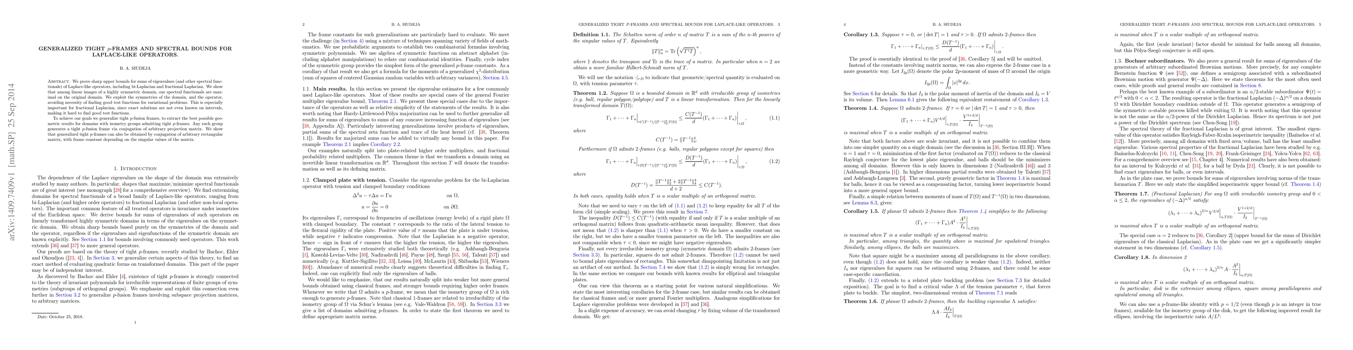 We prove sharp upper bounds for sums of eigenvalues (and other spectral functionals) of Laplace-like operators, including bi-Laplacian and fractional Laplacian. We show that among linear images of a highly symmetric domain, our spectral functionals are maximal on the original domain. We exploit the symmetries of the domain, and the operator, avoiding necessity of finding good test functions for variational problems. This is especially important for fractional Laplacian, since exact solutions are not even known on intervals, making it hard to find good test functions. To achieve our goals we generalize tight $p$-fusion frames, to extract the best possible geometric results for domains with isometry groups admitting tight $p$-frames. Any such group generates a tight $p$-fusion frame via conjugation of arbitrary projection matrix. We show that generalized tight $p$-frames can also be obtained by conjugation of arbitrary rectangular matrix, with frame constant depending on the singular values of the matrix.