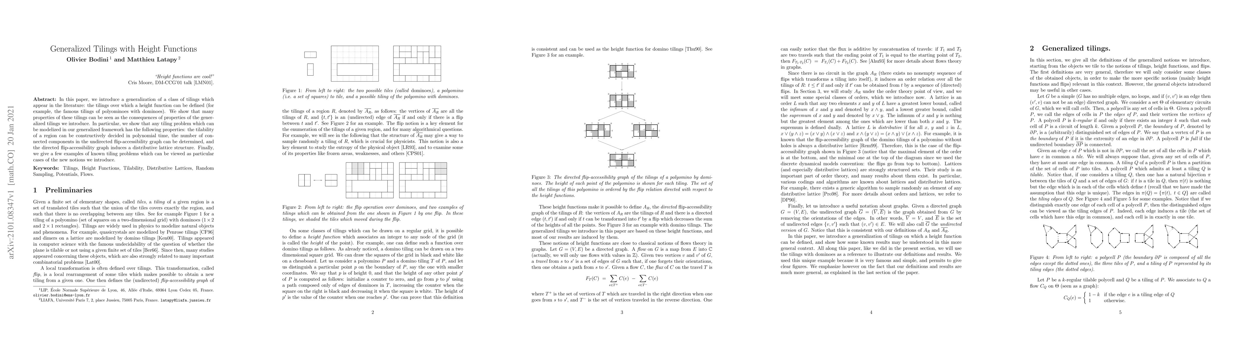 In this paper, we introduce a generalization of a class of tilings which appear in the literature: the tilings over which a height function can be defined (for example, the famous tilings of polyominoes with dominoes). We show that many properties of these tilings can be seen as the consequences of properties of the generalized tilings we introduce. In particular, we show that any tiling problem which can be modelized in our generalized framework has the following properties: the tilability of a region can be constructively decided in polynomial time, the number of connected components in the undirected flip-accessibility graph can be determined, and the directed flip-accessibility graph induces a distributive lattice structure. Finally, we give a few examples of known tiling problems which can be viewed as particular cases of the new notions we introduce.