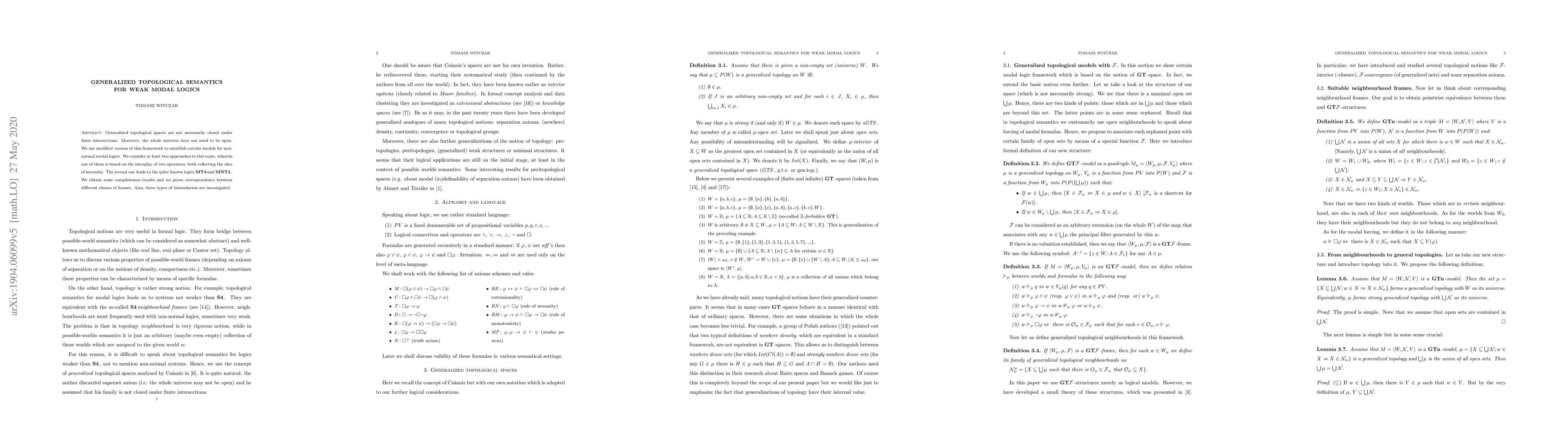 Generalized topological spaces are not necessarily closed under finite intersections. Moreover, the whole universe does not need to be open. We use modified version of this framework to establish certain models for non-normal modal logics. We consider at least two approaches to this topic, wherein one of them is based on the interplay of two operators, both reflecting the idea of necessity. The second one leads to the quite known logics MT4 and MNT4. We obtain some completeness results and we prove correspondence between different classes of frames. Also, three types of bisimulation are investigated.