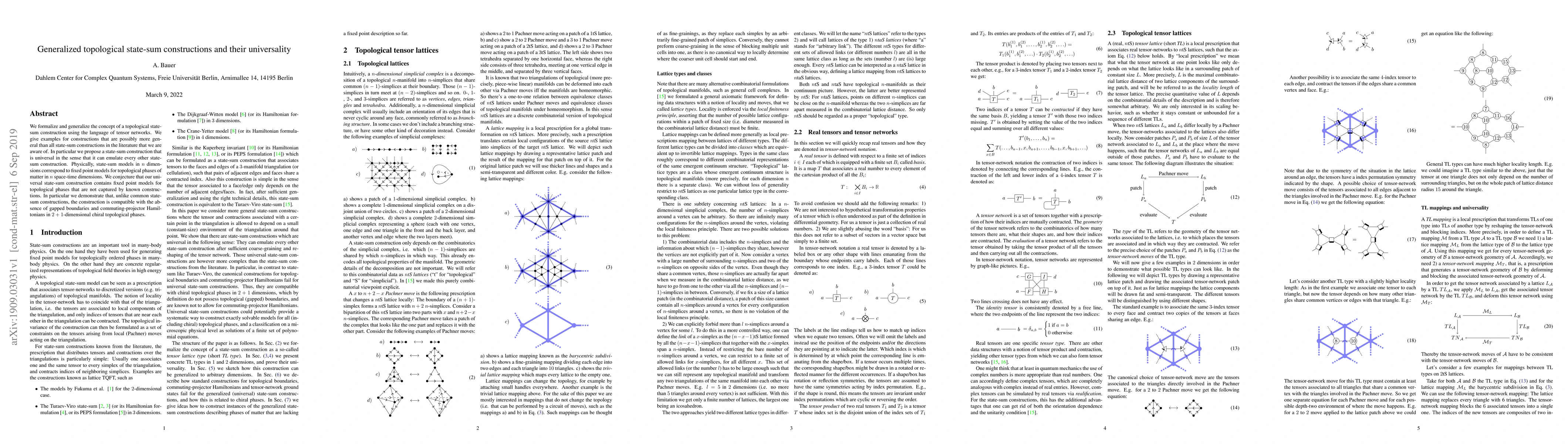 The novelty of this work lies in its generalization of topological state-sum constructions, the introduction of universality for these constructions, and the proposal of a universal TL type (ntSU) capable of emulating all other TL types, potentially capturing topological phases not described by existing constructions.