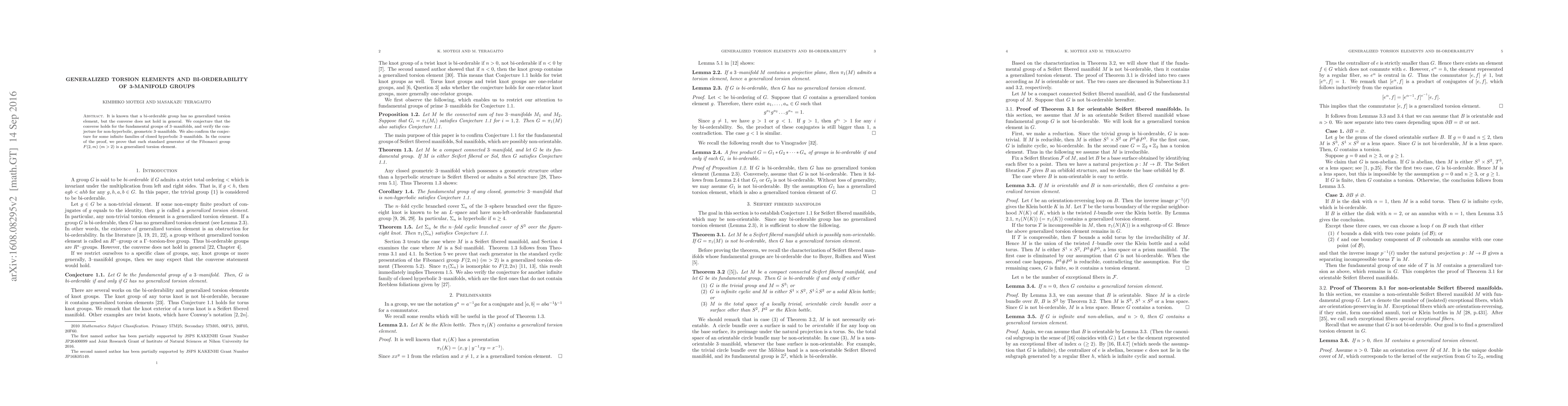 This paper explores the relationship between bi-orderability and the absence of generalized torsion elements in the fundamental groups of 3-manifolds, proving the conjecture for non-hyperbolic geometric 3-manifolds and certain infinite families of closed hyperbolic 3-manifolds. Additionally, it demonstrates that each standard generator of the Fibonacci group F(2,m) (m>2) is a generalized torsion element.