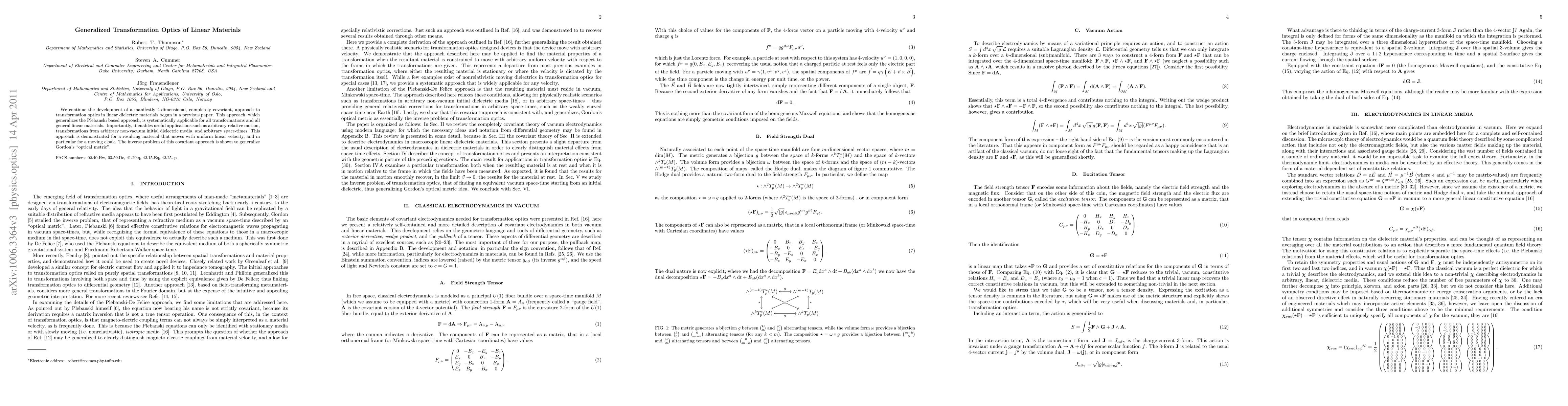 We continue the development of a manifestly 4-dimensional, completely covariant, approach to transformation optics in linear dielectric materials begun in a previous paper. This approach, which generalizes the Plebanski based approach, is systematically applicable for all transformations and all general linear materials. Importantly, it enables useful applications such as arbitrary relative motion, transformations from arbitrary non-vacuum initial dielectric media, and arbitrary space-times. This approach is demonstrated for a resulting material that moves with uniform linear velocity. The inverse problem of this covariant approach is shown to generalize Gordon's "optical metric".