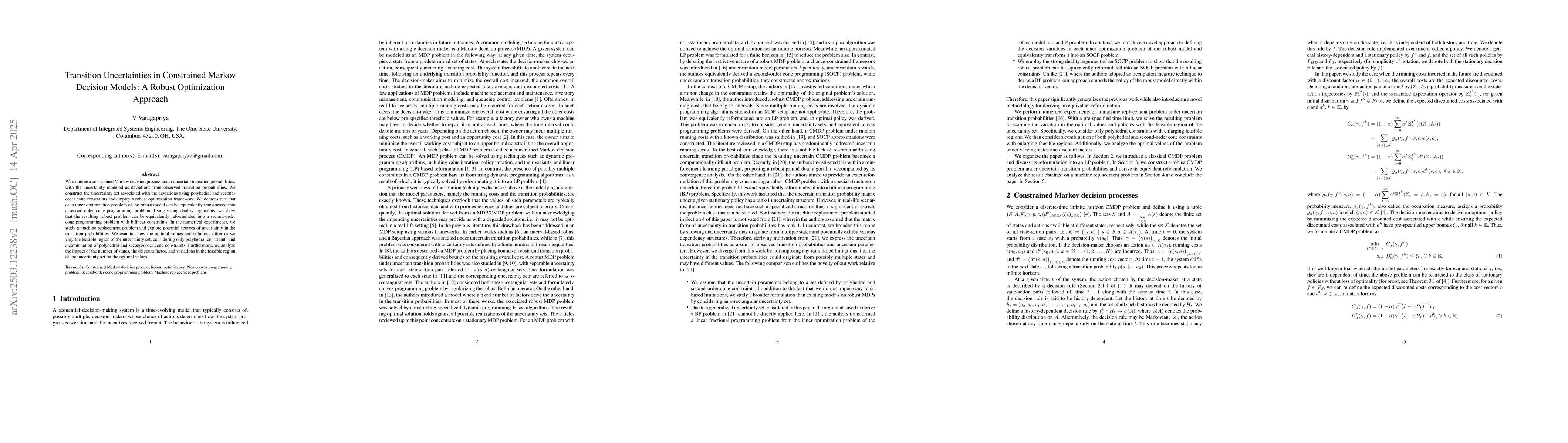 The research investigates a constrained Markov Decision Process (CMDP) with uncertain transition probabilities, employing a robust optimization framework. The uncertainty set for transition probabilities is constructed using polyhedral and second-order cone constraints, and the inner optimization problems of the robust model are transformed into Second-Order Cone Programming (SOCP) problems.