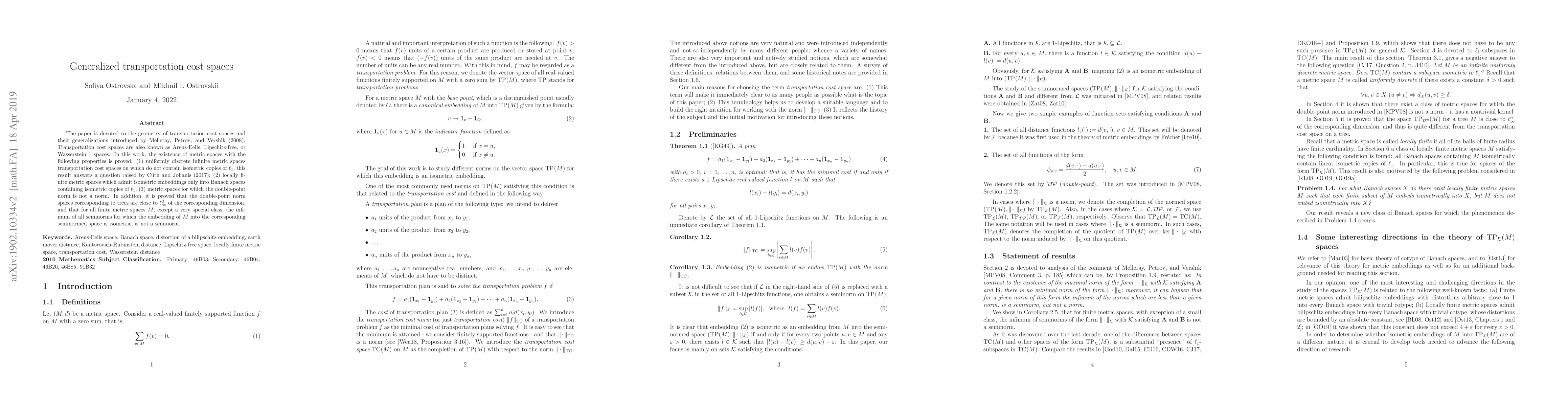 The paper is devoted to the geometry of transportation cost spaces and their generalizations introduced by Melleray, Petrov, and Vershik (2008). Transportation cost spaces are also known as Arens-Eells, Lipschitz-free, or Wasserstein $1$ spaces. In this work, the existence of metric spaces with the following properties is proved: (1) uniformly discrete infinite metric spaces transportation cost spaces on which do not contain isometric copies of $\ell_1$, this result answers a question raised by Cuth and Johanis (2017); (2) locally finite metric spaces which admit isometric embeddings only into Banach spaces containing isometric copies of $\ell_1$; (3) metric spaces for which the double-point norm is not a norm. In addition, it is proved that the double-point norm spaces corresponding to trees are close to $\ell_\infty^d$ of the corresponding dimension, and that for all finite metric spaces $M$, except a very special class, the infimum of all seminorms for which the embedding of $M$ into the corresponding seminormed space is isometric, is not a seminorm.