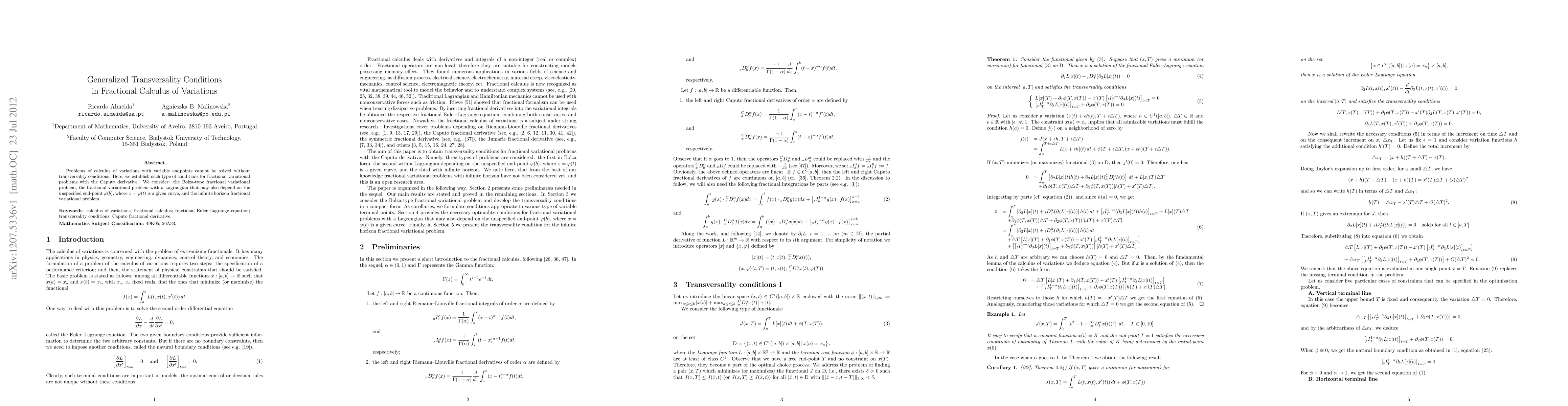 This paper establishes generalized transversality conditions for fractional calculus of variations, specifically for Bolza-type problems, problems with endpoint-dependent Lagrangians, and infinite horizon problems using the Caputo derivative. These conditions are essential for solving fractional variational problems with variable endpoints.