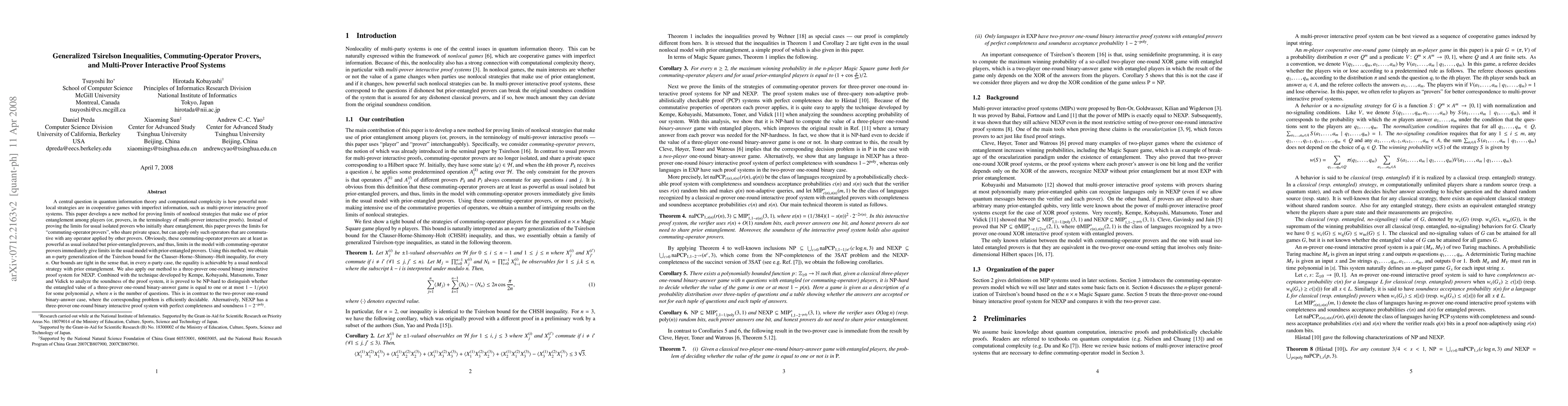 A central question in quantum information theory and computational complexity is how powerful nonlocal strategies are in cooperative games with imperfect information, such as multi-prover interactive proof systems. This paper develops a new method for proving limits of nonlocal strategies that make use of prior entanglement among players (or, provers, in the terminology of multi-prover interactive proofs). Instead of proving the limits for usual isolated provers who initially share entanglement, this paper proves the limits for "commuting-operator provers", who share private space, but can apply only such operators that are commutative with any operator applied by other provers. Commuting-operator provers are at least as powerful as usual isolated but prior-entangled provers, and thus, limits for commuting-operator provers immediately give limits for usual entangled provers. Using this method, we obtain an n-party generalization of the Tsirelson bound for the Clauser-Horne- Shimony-Holt inequality for every n. Our bounds are tight in the sense that, in every n-party case, the equality is achievable by a usual nonlocal strategy with prior entanglement. We also apply our method to a 3-prover 1-round binary interactive proof for NEXP. Combined with the technique developed by Kempe, Kobayashi, Matsumoto, Toner and Vidick to analyze the soundness of the proof system, it is proved to be NP-hard to distinguish whether the entangled value of a 3-prover 1-round binary-answer game is equal to 1 or at most 1-1/p(n) for some polynomial p, where n is the number of questions. This is in contrast to the 2-prover 1-round binary-answer case, where the corresponding problem is efficiently decidable. Alternatively, NEXP has a 3-prover 1-round binary interactive proof system with perfect completeness and soundness 1-2^{-poly}.