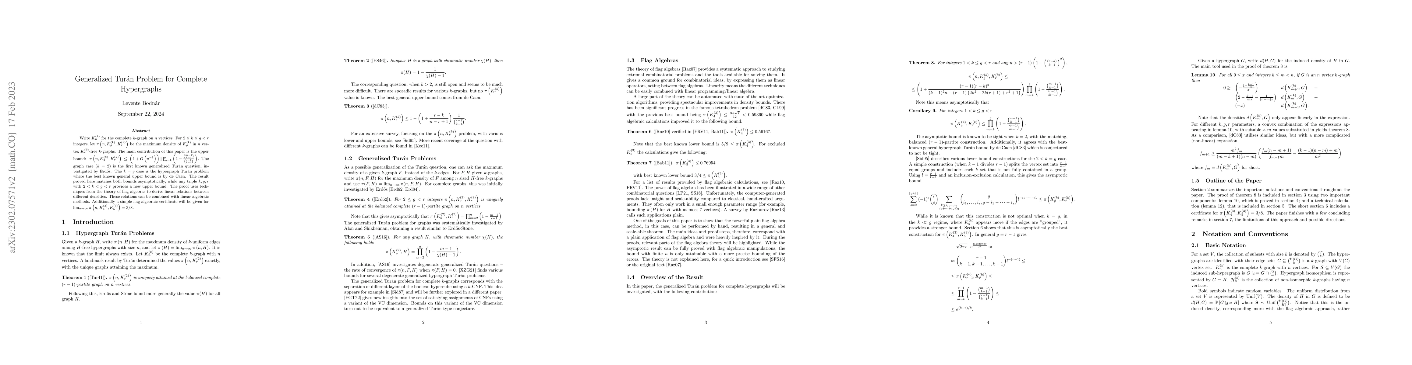 Write $K^{(k)}_{n}$ for the complete $k$-graph on $n$ vertices. For $2 \leq k \leq g < r$ integers, let $\pi\left(n, K^{(k)}_{g}, K^{(k)}_r\right)$ be the maximum density of $K^{(k)}_{g}$ in $n$ vertex $K^{(k)}_{r}$-free $k$-graphs. The main contribution of this paper is the upper bound: $\pi\left(n, K^{(k)}_{g}, K^{(k)}_r\right) \leq \left(1 + O\left(n^{-1}\right) \right)\prod_{m=k}^{g} \left(1 - \frac{\binom{m-1}{k-1}}{\binom{r-1}{k-1}} \right).$ The graph case ($k=2$) is the first known generalized Tur\'an question, investigated by Erd\H{o}s. The $k=g$ case is the hypergraph Tur\'an problem where the best known general upper bound is by de Caen. The result proved here matches both bounds asymptotically, while any triple $k, g, r$ with $2 < k < g < r$ provides a new upper bound. The proof uses techniques from the theory of flag algebras to derive linear relations between different densities. These relations can be combined with linear algebraic methods. Additionally a simple flag algebraic certificate will be given for $\lim_{n \rightarrow \infty} \pi \left(n, K^{(3)}_4, K^{(3)}_5 \right) = 3/8$.