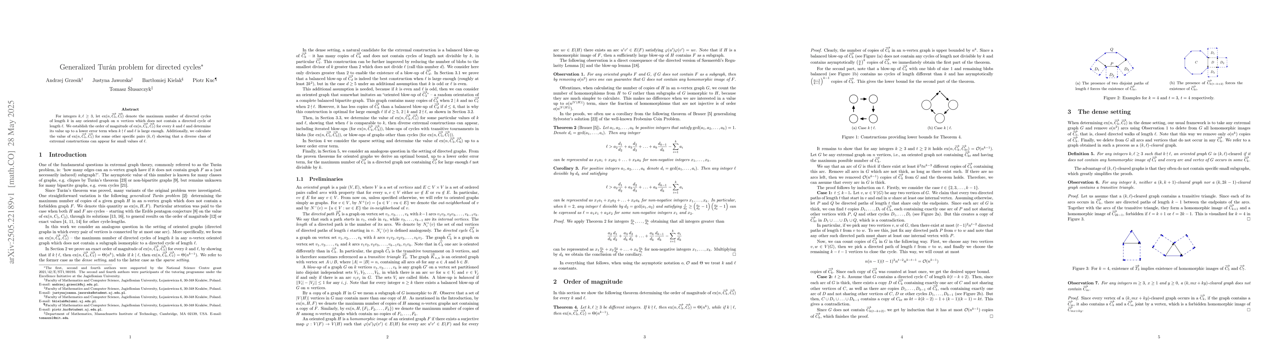 This research contributes to the extremal graph theory by resolving the generalized Turán problem for directed cycles, which has implications in network analysis, graph algorithms, and combinatorial optimization.