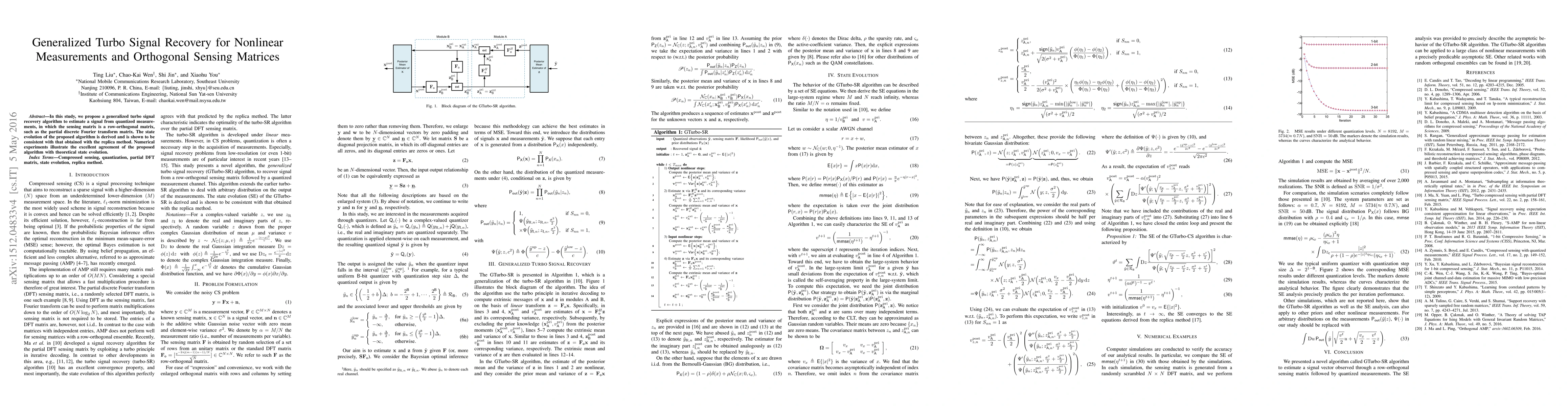 This paper introduces a generalized turbo signal recovery algorithm for estimating signals from quantized measurements using row-orthogonal sensing matrices. Theoretical state evolution is derived and verified through numerical experiments to align with replica method predictions.