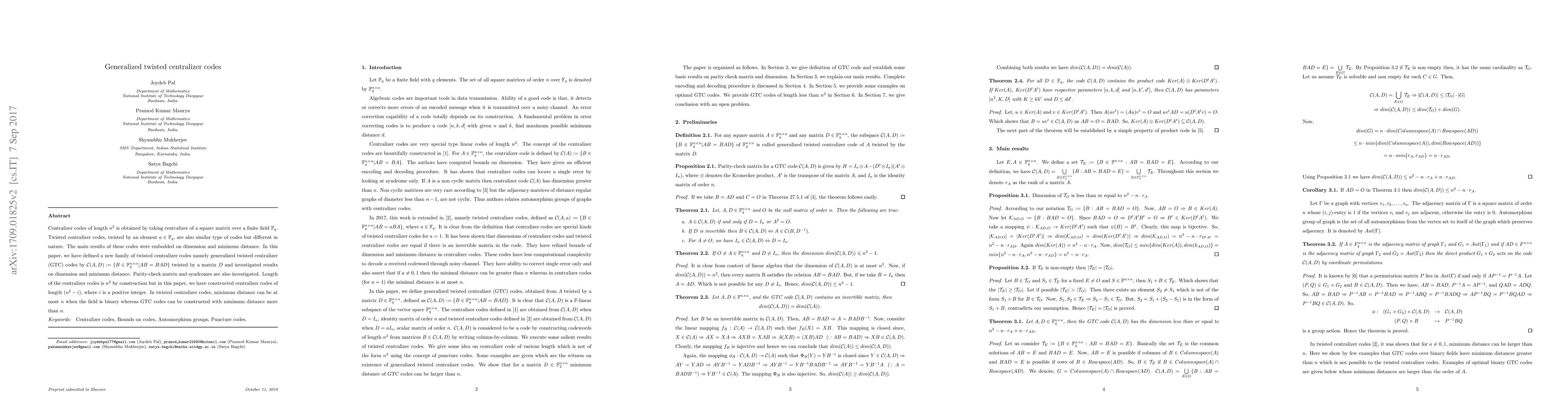An important code of length $n^2$ is obtained by taking centralizer of a square matrix over a finite field $\mathbb{F}_q$. Twisted centralizer codes, twisted by an element $a \in \mathbb{F}_q$, are also similar type of codes but different in nature. The main results were embedded on dimension and minimum distance. In this paper, we have defined a new family of twisted centralizer codes namely generalized twisted centralizer (GTC) codes by $\mathcal{C}(A,D):= \lbrace B \in \mathbb{F}_q^{n \times n}|AB=BAD \rbrace$ twisted by a matrix $D$ and investigated results on dimension and minimum distance. Parity-check matrix and syndromes are also investigated. Length of the centralizer codes is $n^2$ by construction but in this paper, we have constructed centralizer codes of length $(n^2-i)$, where $i$ is a positive integer. In twisted centralizer codes, minimum distance can be at most $n$ when the field is binary whereas GTC codes can be constructed with minimum distance more than $n$.