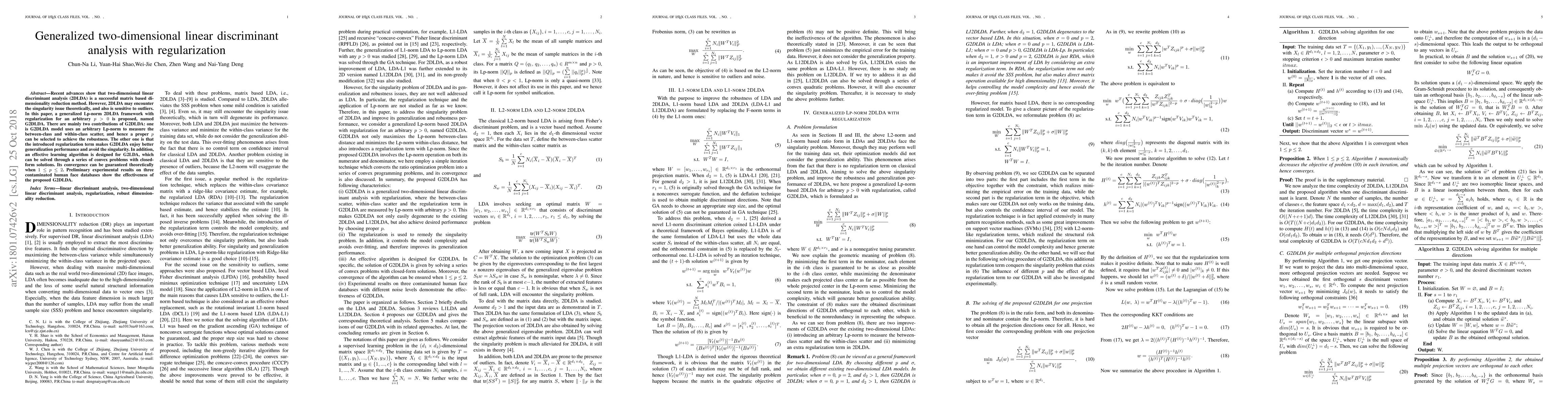 Recent advances show that two-dimensional linear discriminant analysis (2DLDA) is a successful matrix based dimensionality reduction method. However, 2DLDA may encounter the singularity issue theoretically and the sensitivity to outliers. In this paper, a generalized Lp-norm 2DLDA framework with regularization for an arbitrary $p>0$ is proposed, named G2DLDA. There are mainly two contributions of G2DLDA: one is G2DLDA model uses an arbitrary Lp-norm to measure the between-class and within-class scatter, and hence a proper $p$ can be selected to achieve the robustness. The other one is that by introducing an extra regularization term, G2DLDA achieves better generalization performance, and solves the singularity problem. In addition, G2DLDA can be solved through a series of convex problems with equality constraint, and it has closed solution for each single problem. Its convergence can be guaranteed theoretically when $1\leq p\leq2$. Preliminary experimental results on three contaminated human face databases show the effectiveness of the proposed G2DLDA.
