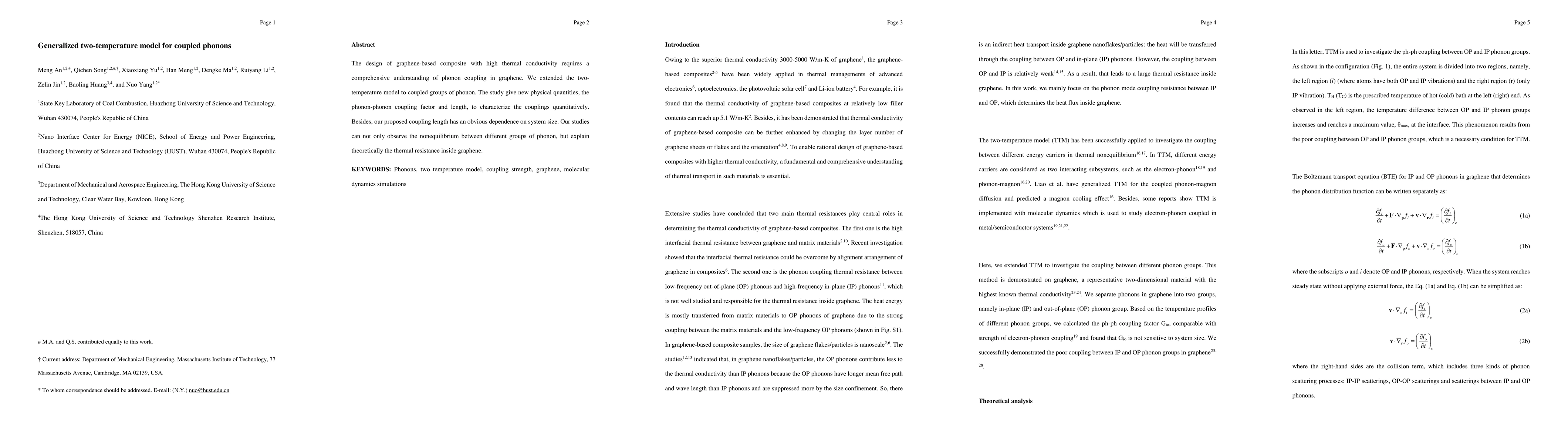 The design of graphene-based composite with high thermal conductivity requires a comprehensive understanding of phonon coupling in graphene. We extended the two-temperature model to coupled groups of phonon. The study give new physical quantities, the phonon-phonon coupling factor and length, to characterize the couplings quantitatively. Besides, our proposed coupling length has an obvious dependence on system size. Our studies can not only observe the nonequilibrium between different groups of phonon, but explain theoretically the thermal resistance inside graphene.