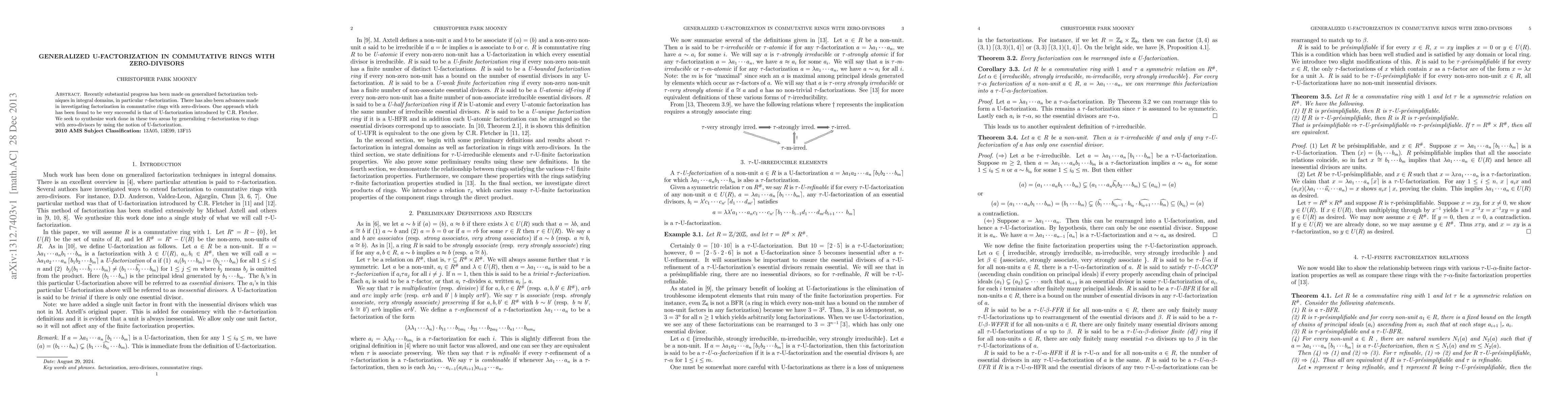 This paper synthesizes recent advances in generalized factorization techniques in integral domains, specifically $\tau$-factorization, with the successful U-factorization approach in commutative rings with zero-divisors, aiming to generalize $\tau$-factorization to such rings using the concept of U-factorization.