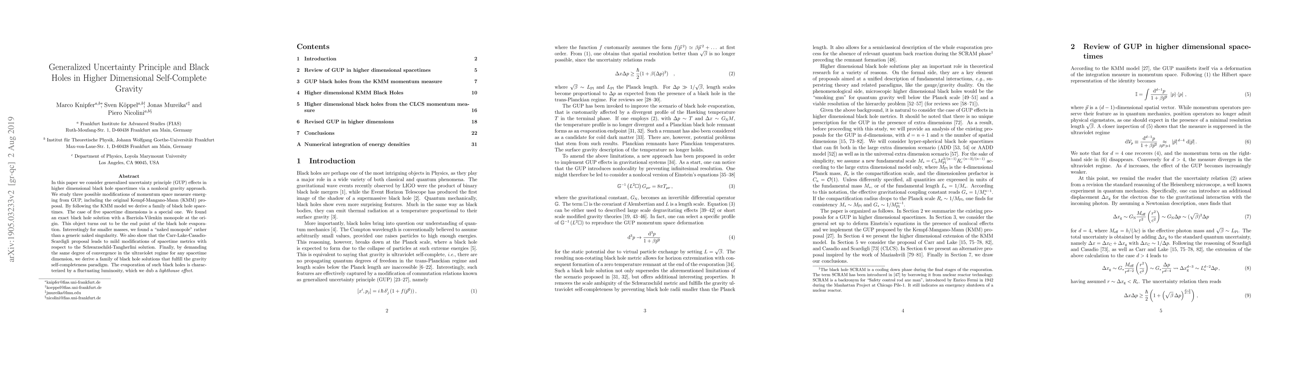 In this paper we consider generalized uncertainty principle (GUP) effects in higher dimensional black hole spacetimes via a nonlocal gravity approach. We study three possible modifications of momentum space measure emerging from GUP, including the original Kempf-Mangano-Mann (KMM) proposal. By following the KMM model we derive a family of black hole spacetimes. The case of five spacetime dimensions is a special one. We found an exact black hole solution with a Barriola-Vilenkin monopole at the origin. This object turns out to be the end point of the black hole evaporation. Interestingly for smaller masses, we found a "naked monopole" rather than a generic naked singularity. We also show that the Carr-Lake-Casadio-Scardigli proposal leads to mild modifications of spacetime metrics with respect to the Schwarzschild-Tangherlini solution. Finally, by demanding the same degree of convergence in the ultraviolet regime for any spacetime dimension, we derive a family of black hole solutions that fulfill the gravity self-completeness paradigm. The evaporation of such black holes is characterized by a fluctuating luminosity, which we dub a lighthouse effect.