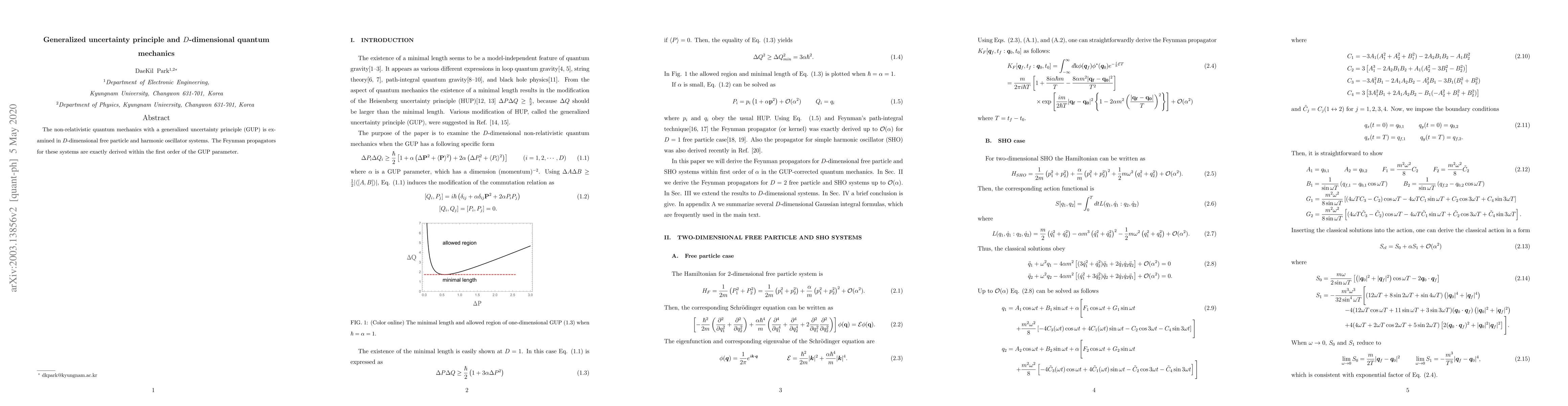 This paper investigates non-relativistic quantum mechanics with a generalized uncertainty principle (GUP) in $D$-dimensional free particle and harmonic oscillator systems, deriving exact Feynman propagators to first order in the GUP parameter. The study provides insights into the effects of GUP on quantum dynamics in higher dimensions.