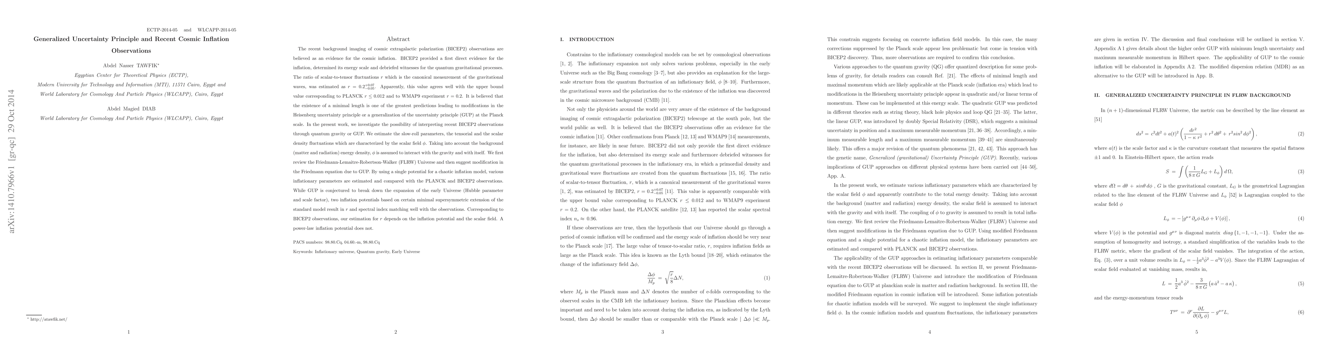 The recent background imaging of cosmic extragalactic polarization (BICEP2) observations are believed as an evidence for the cosmic inflation. BICEP2 provided a first direct evidence for the inflation, determined its energy scale and debriefed witnesses for the quantum gravitational processes. The ratio of scalar-to-tensor fluctuations $r$ which is the canonical measurement of the gravitational waves, was estimated as $r=0.2_{-0.05}^{+0.07}$. Apparently, this value agrees well with the upper bound value corresponding to PLANCK $r\leq 0.012$ and to WMAP9 experiment $r=0.2$. It is believed that the existence of a minimal length is one of the greatest predictions leading to modifications in the Heisenberg uncertainty principle or a GUP at the Planck scale. In the present work, we investigate the possibility of interpreting recent BICEP2 observations through quantum gravity or GUP. We estimate the slow-roll parameters, the tensorial and the scalar density fluctuations which are characterized by the scalar field $\phi$. Taking into account the background (matter and radiation) energy density, $\phi$ is assumed to interact with the gravity and with itself. We first review the Friedmann-Lemaitre-Robertson-Walker (FLRW) Universe and then suggest modification in the Friedmann equation due to GUP. By using a single potential for a chaotic inflation model, various inflationary parameters are estimated and compared with the PLANCK and BICEP2 observations. While GUP is conjectured to break down the expansion of the early Universe (Hubble parameter and scale factor), two inflation potentials based on certain minimal supersymmetric extension of the standard model result in $r$ and spectral index matching well with the observations. Corresponding to BICEP2 observations, our estimation for $r$ depends on the inflation potential and the scalar field. A power-law inflation potential does not.
