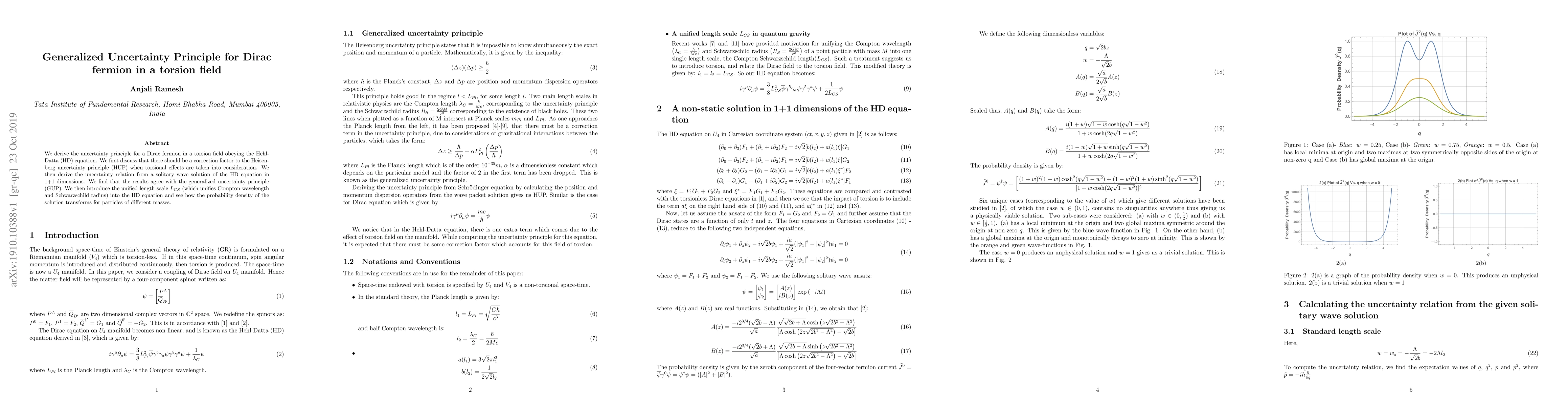 We derive the uncertainty principle for a Dirac fermion in a torsion field obeying the Hehl-Datta (HD) equation. We first discuss that there should be a correction factor to the Heisenberg uncertainty principle (HUP) when torsional effects are taken into consideration. We then derive the uncertainty relation from a solitary wave solution of the HD equation in 1+1 dimensions. We find that the results agree with the generalized uncertainty principle (GUP). We then introduce the unified length scale $L_{CS}$ (which unifies Compton wavelength and Schwarzschild radius) into the HD equation and see how the probability density of the solution transforms for particles of different masses.