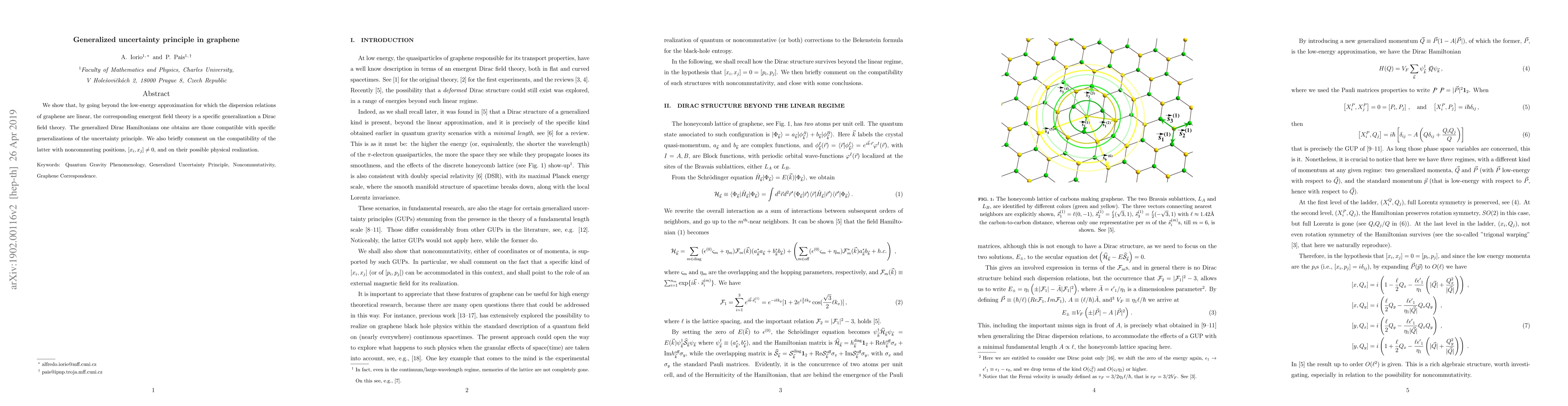 We show that, by going beyond the low-energy approximation for which the dispersion relations of graphene are linear, the corresponding emergent field theory is a specific generalization a Dirac field theory. The generalized Dirac Hamiltonians one obtains are those compatible with specific generalizations of the uncertainty principle. We also briefly comment on the compatibility of the latter with noncommuting positions, $[x_i,x_j] \neq 0$, and on their possible physical realization.